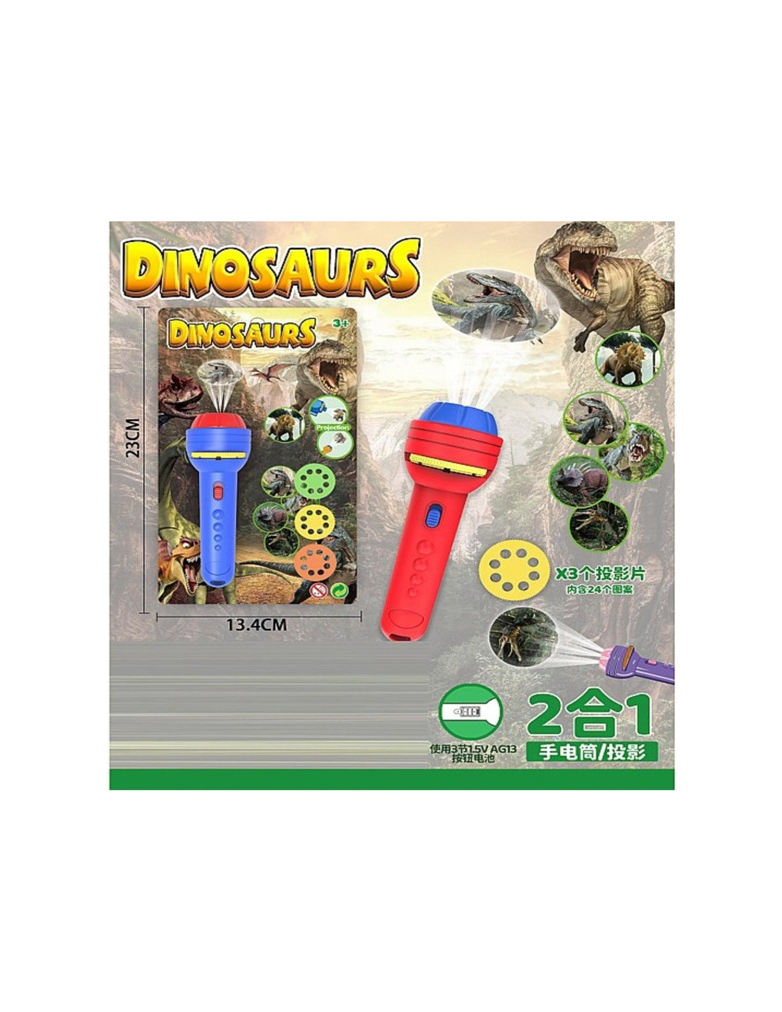 Zabawka działa na zasadzie Projektora - po naciśnięciu przycisku, możemy obejrzeć obrazki przedstawiające 24 dinozaury.