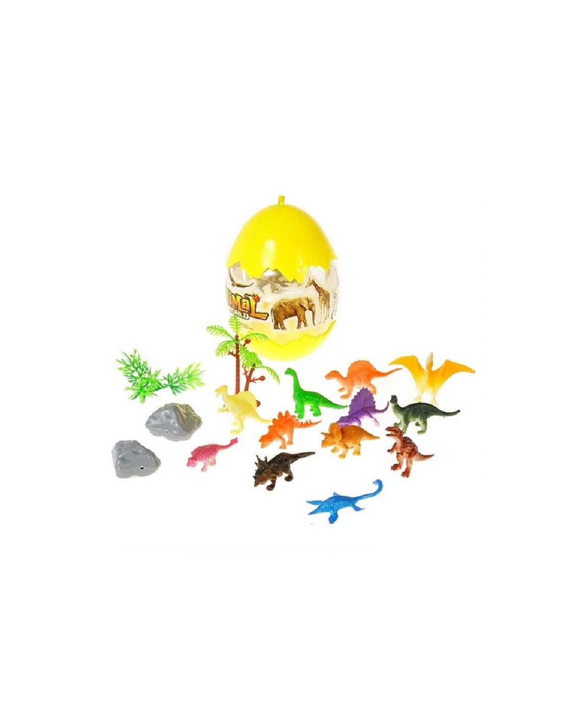 Zestaw kolorowych figurek dinozaurów w jajku.