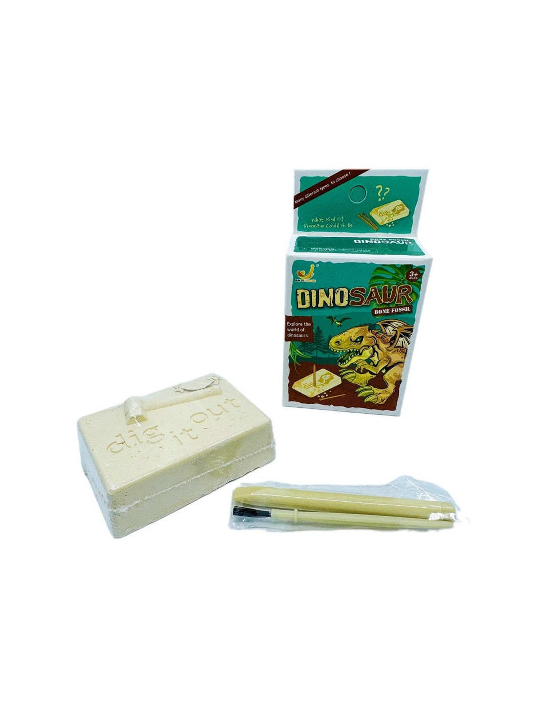 W zestawie znajduje się malutka figurka dinozaura, dłutko oraz skamielina.