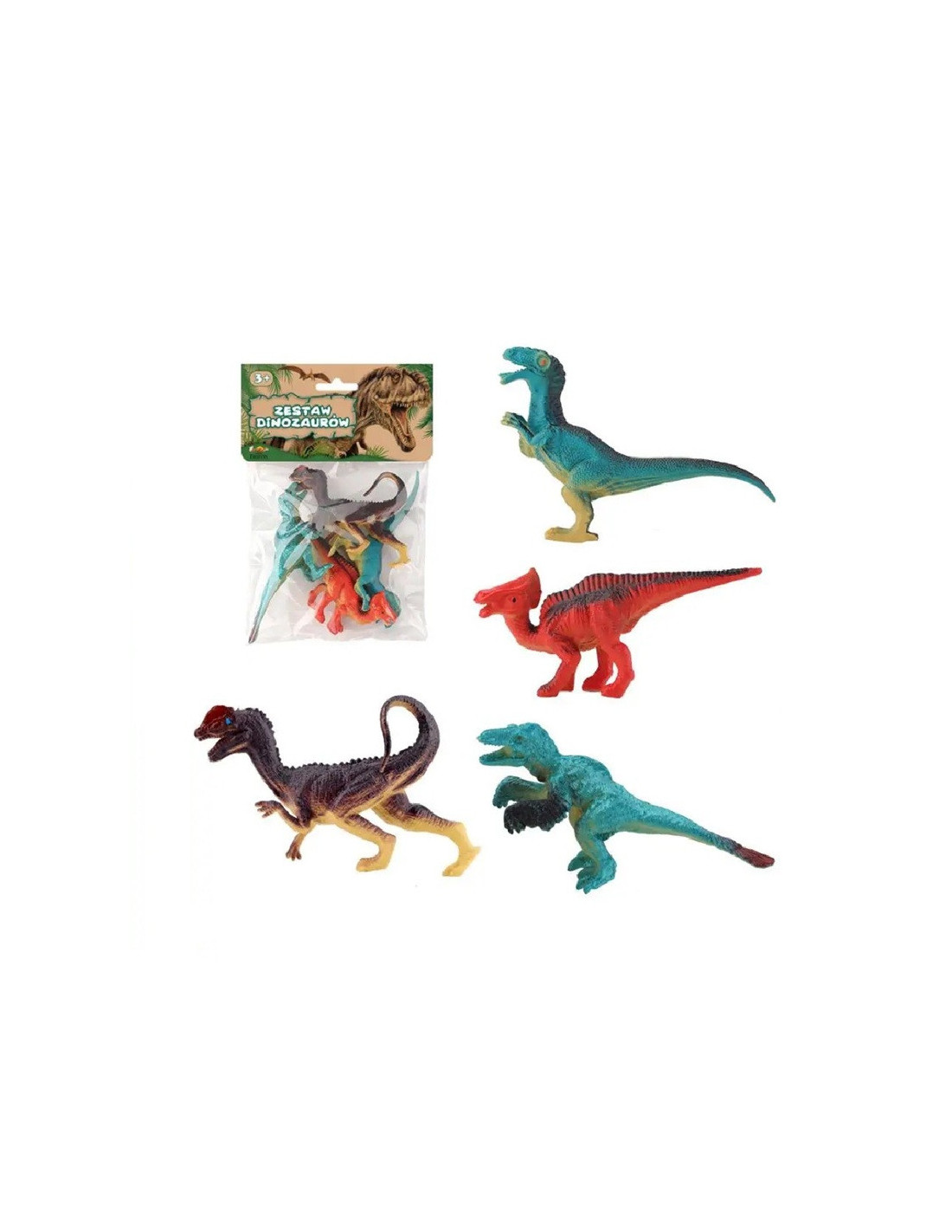 Zestaw kolorowych figurek dinozaurów.