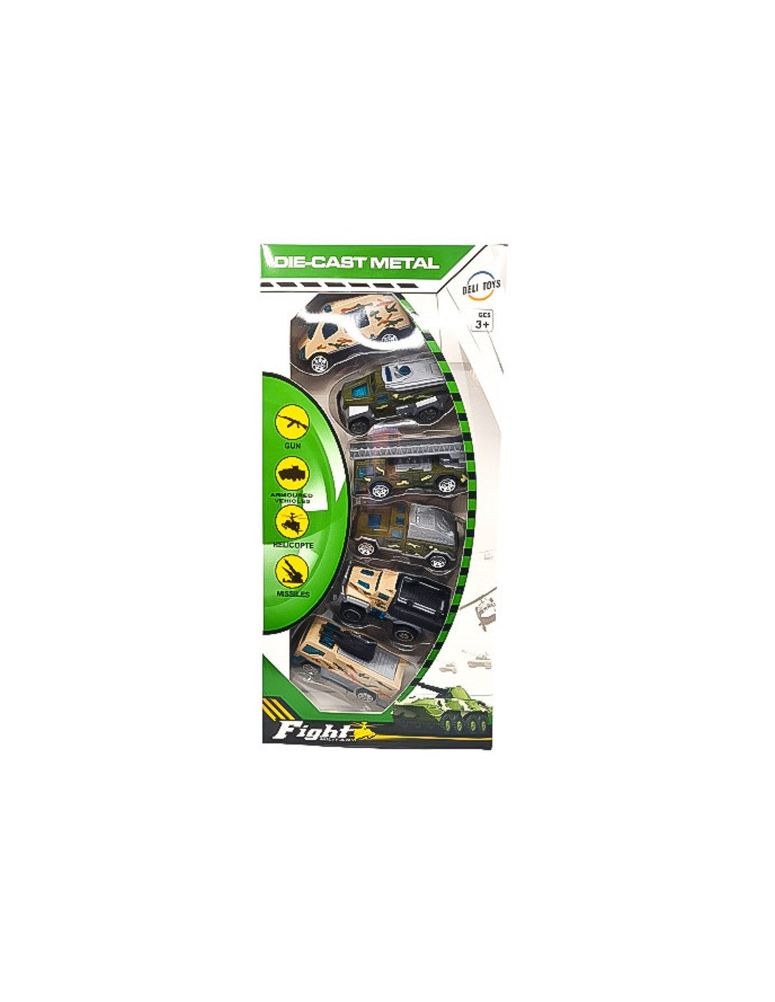 Zestaw kolorowych metalowych pojazdów wojskowych.