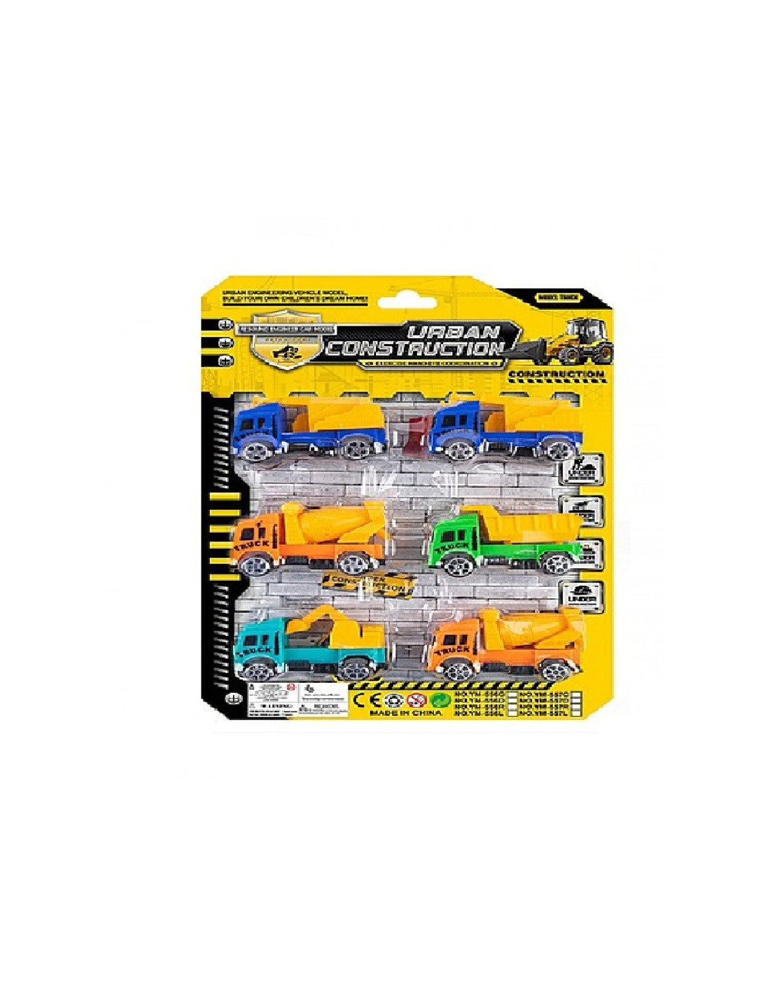 Zestaw kolorowych plastikowych pojazdów budowlanych.