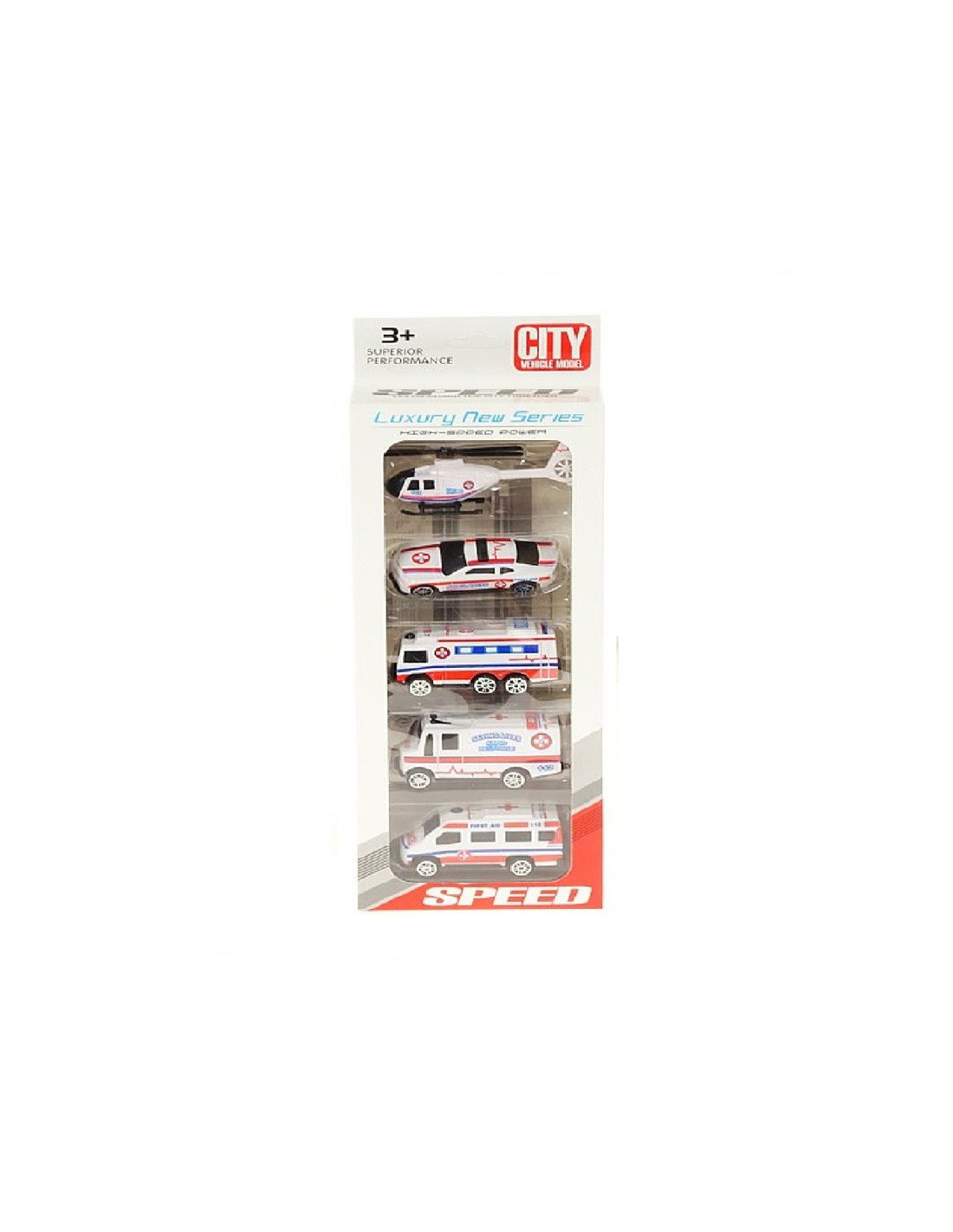 Zestaw kolorowych plastikowych pojazdów pogotowia ratunkowego.