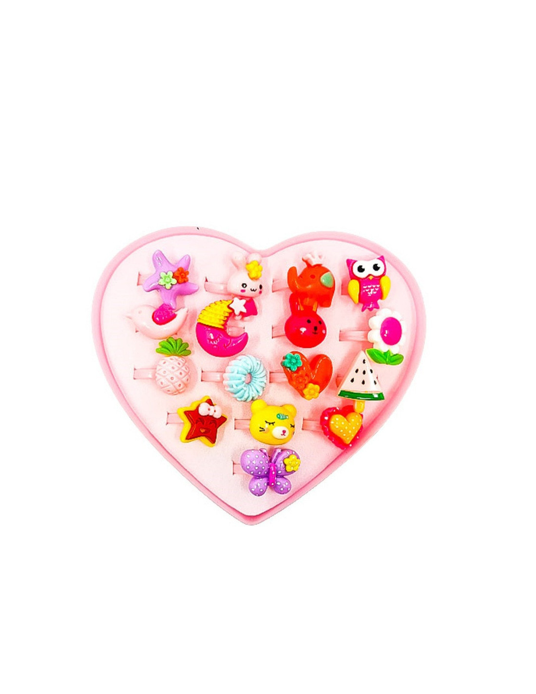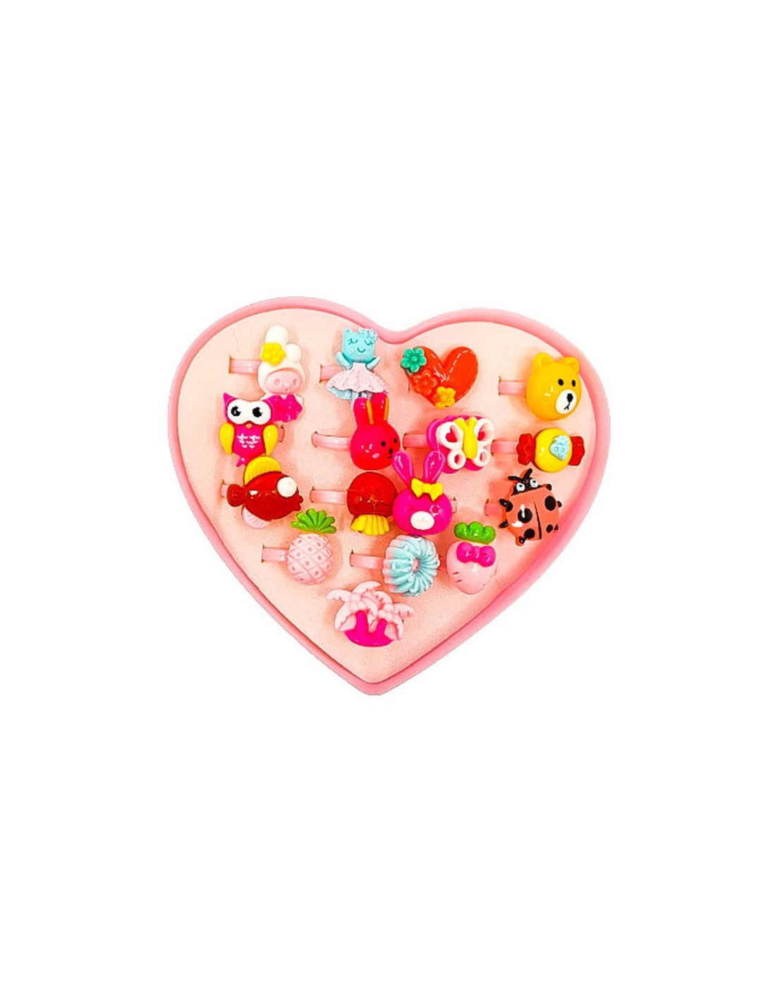 Zestaw pięknych pierścionków dziecięcych z regulacją w różowym pudełeczku w kształcie serca.