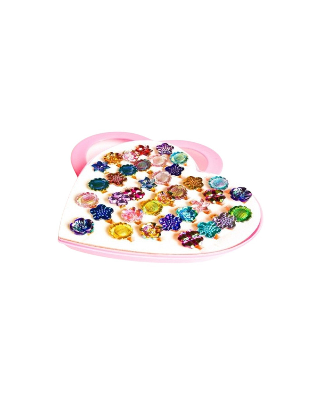 Zestaw pięknych pierścionków dziecięcych z regulacją w różowym pudełeczku w kształcie serca.
