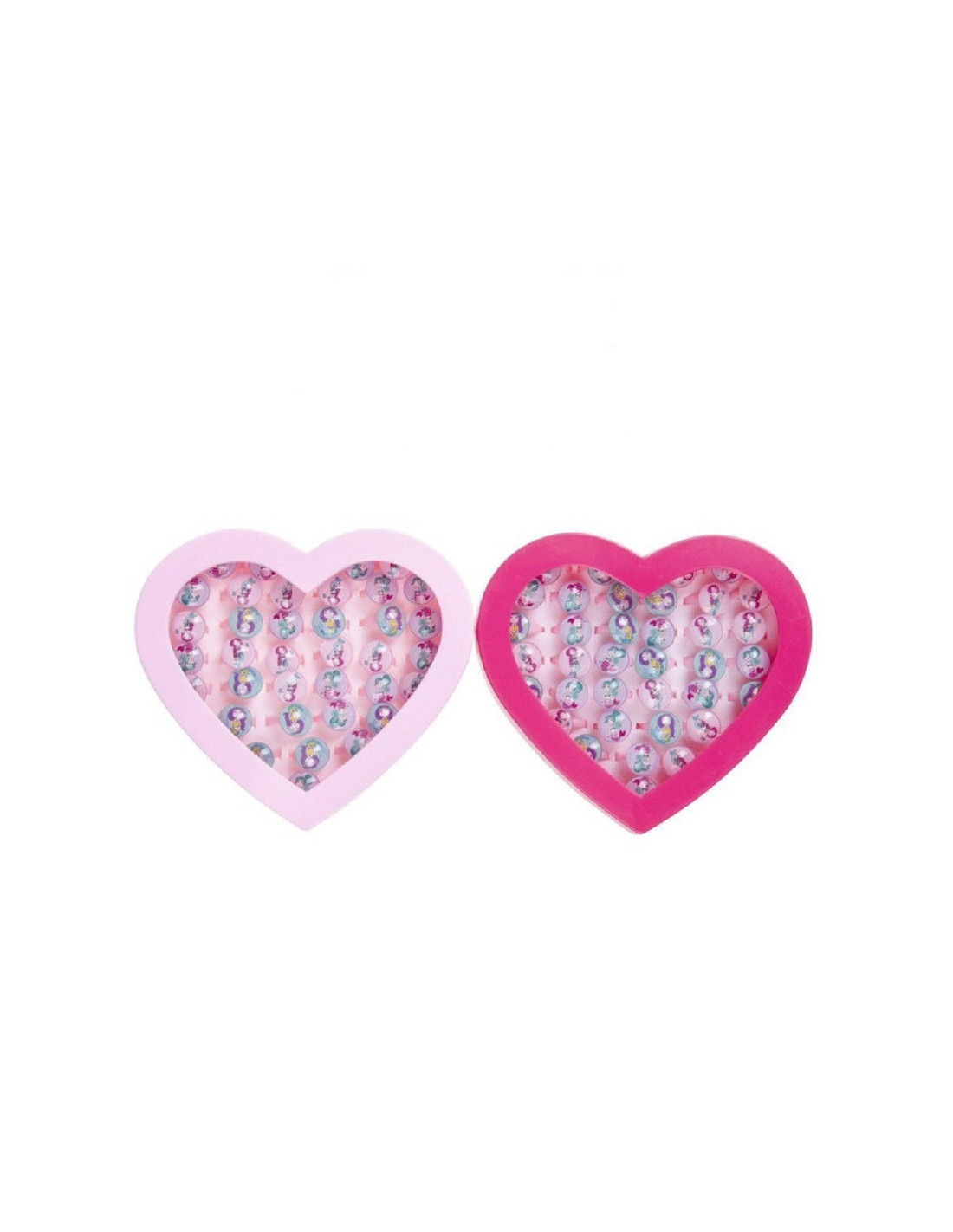 Zestaw pięknych pierścionków dziecięcych z regulacją w różowym pudełeczku w kształcie serca.