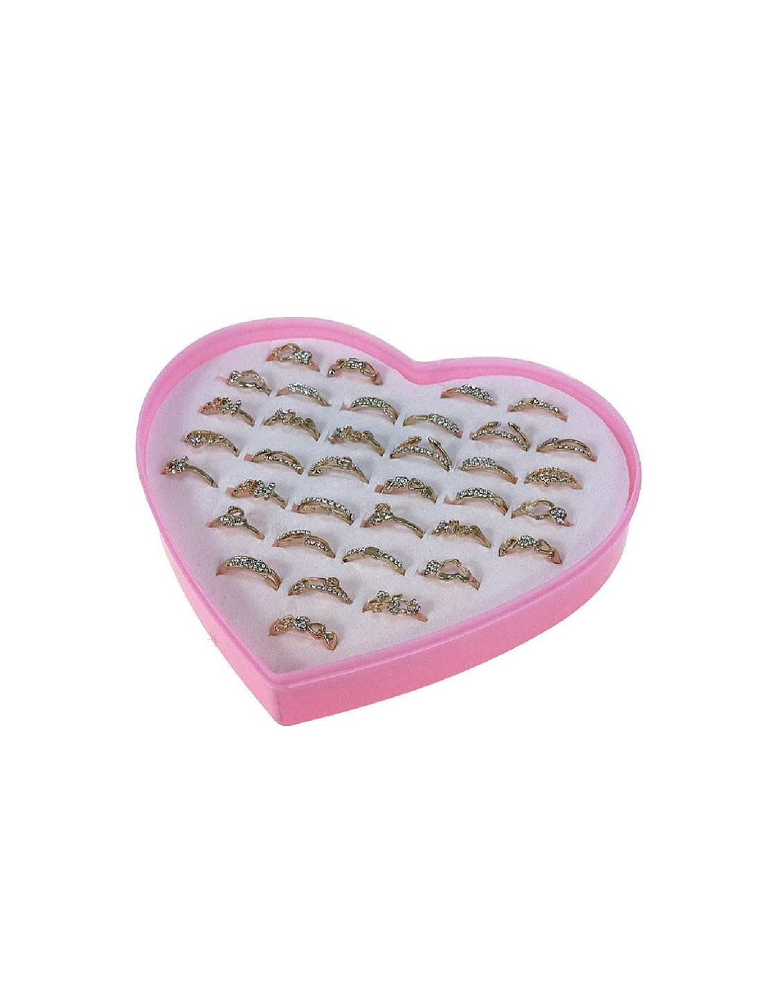Zestaw pięknych pierścionków dziecięcych z regulacją w różowym pudełeczku w kształcie serca.
