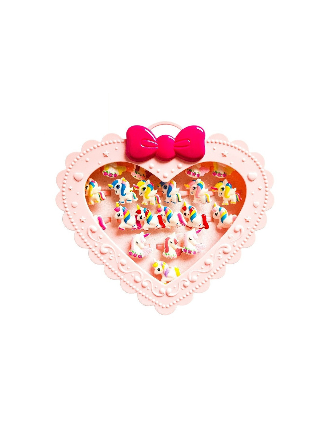 Zestaw pięknych pierścionków dziecięcych z regulacją w różowym pudełeczku w kształcie serca.