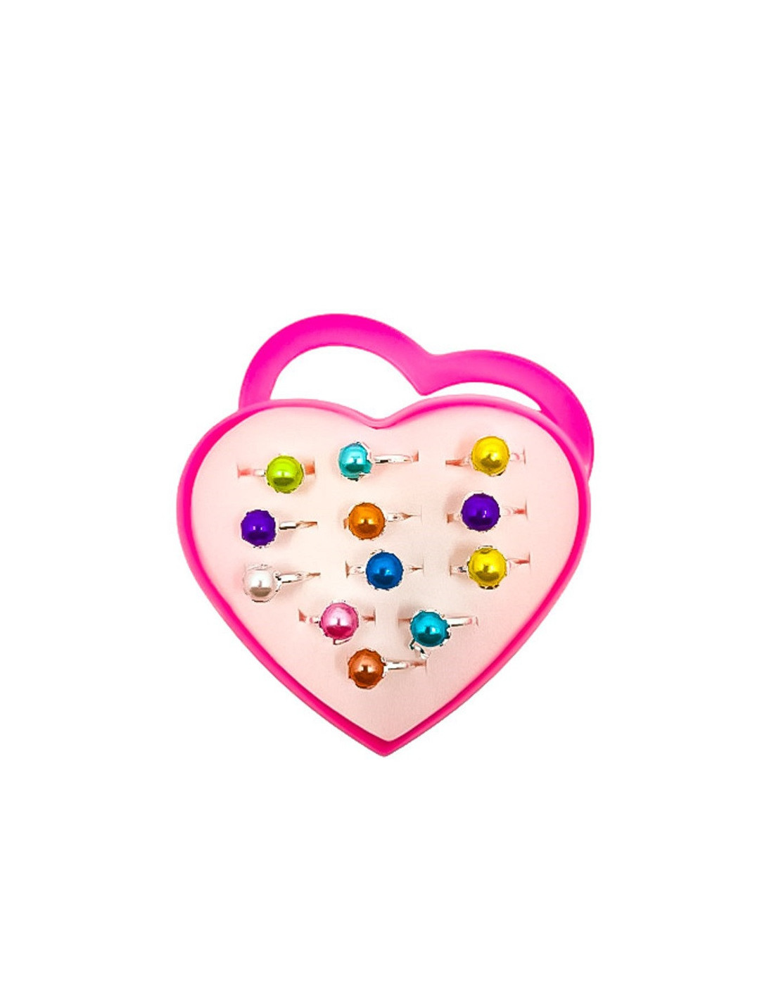 Zestaw pięknych pierścionków dziecięcych z regulacją w różowym pudełeczku w kształcie serca.