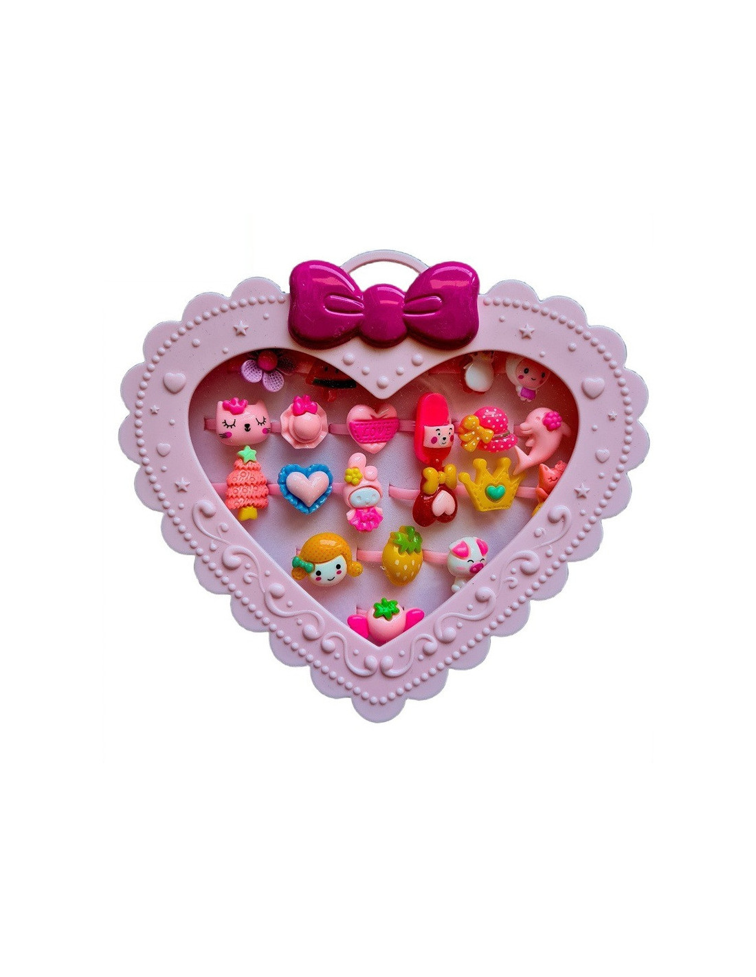 Zestaw pięknych pierścionków dziecięcych z regulacją w różowym pudełeczku w kształcie serca.