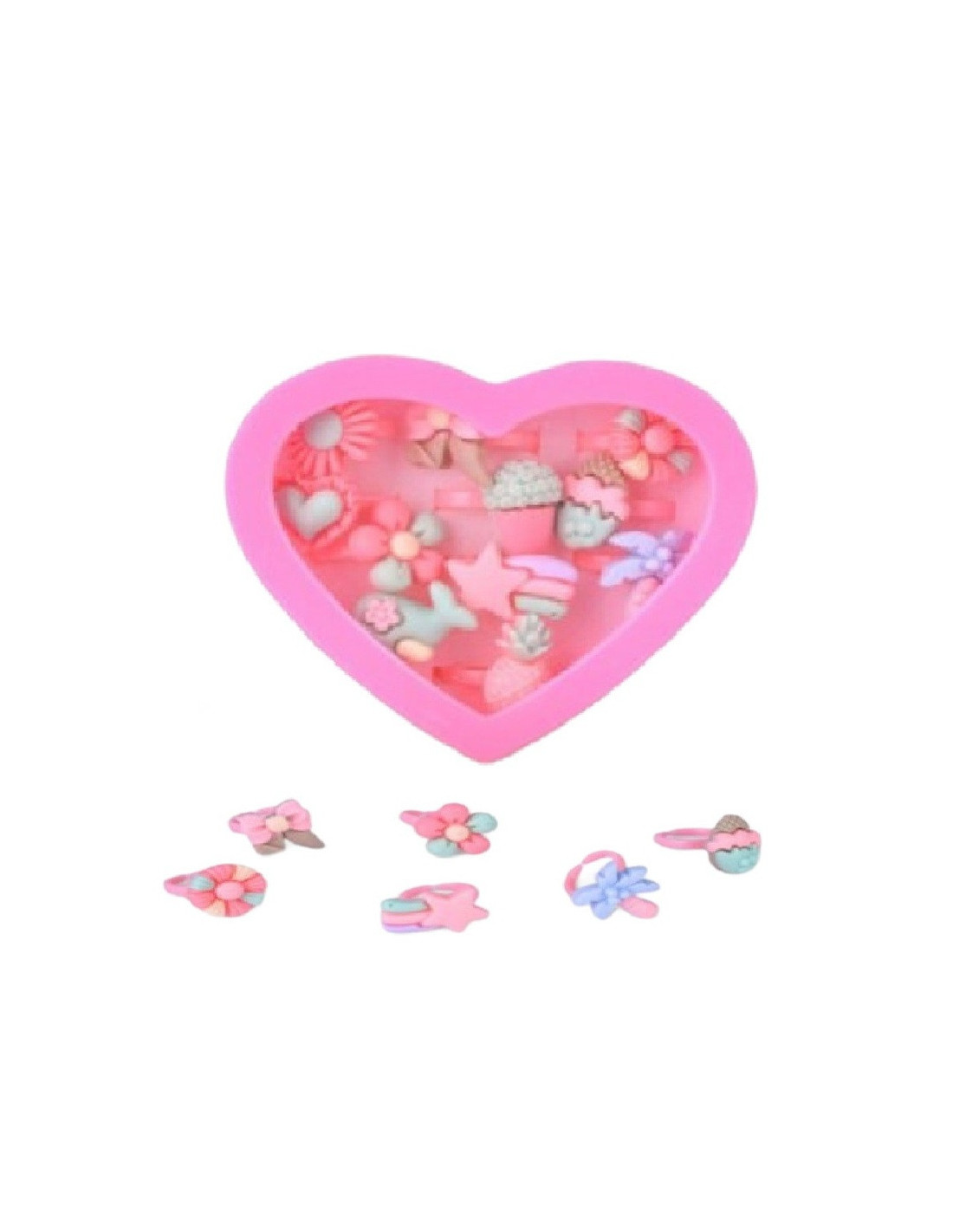 Zestaw pięknych pierścionków dziecięcych z regulacją w różowym pudełeczku w kształcie serca.