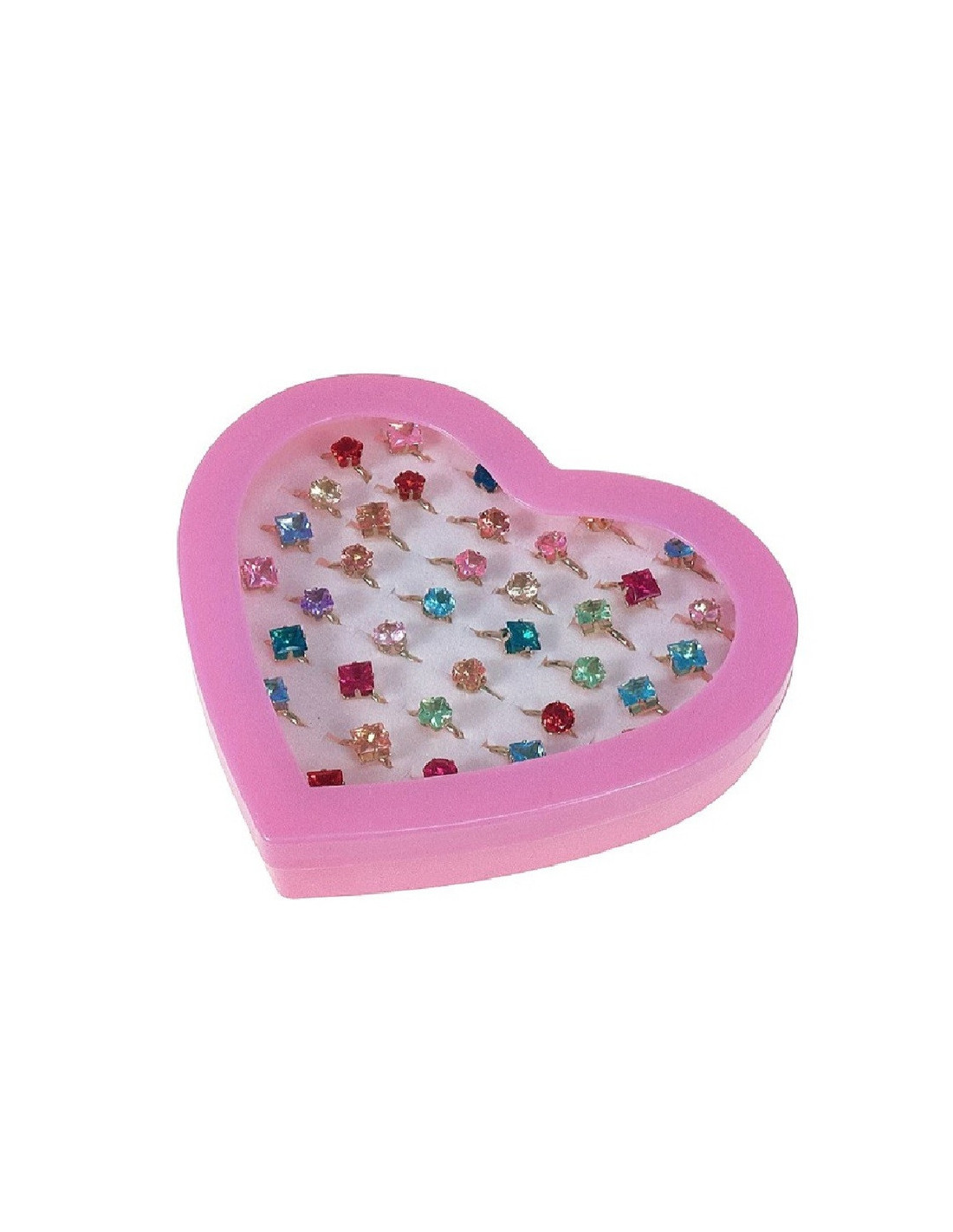 Zestaw pięknych pierścionków dziecięcych z regulacją w różowym pudełeczku w kształcie serca.