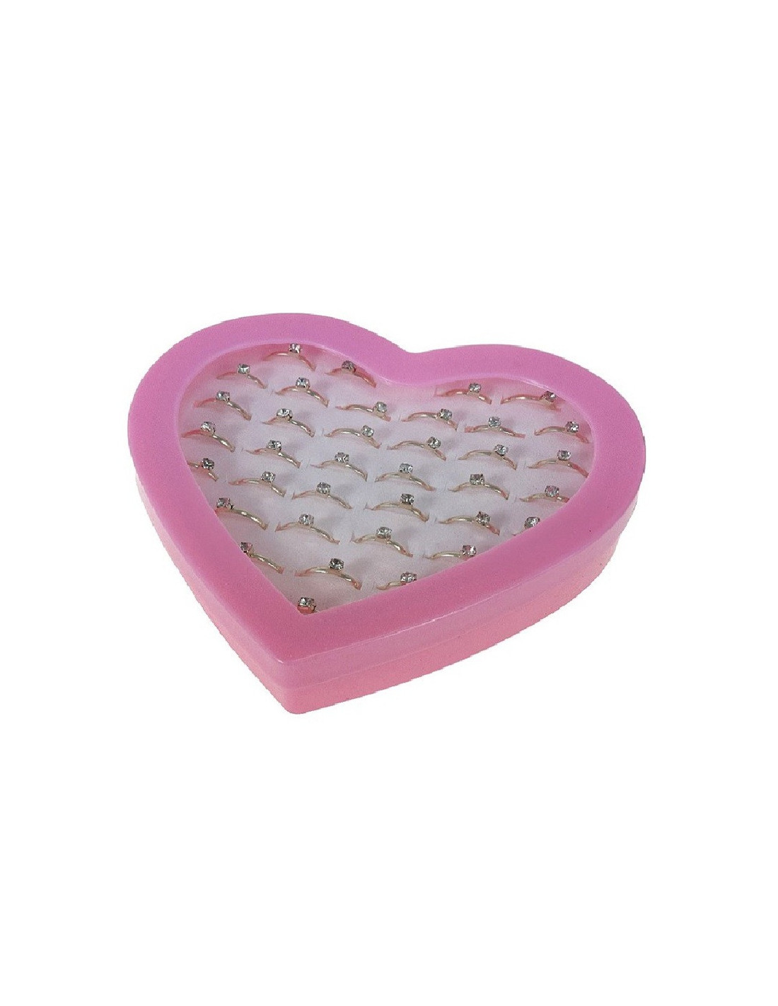 Zestaw pięknych pierścionków dziecięcych z regulacją w różowym pudełeczku w kształcie serca.