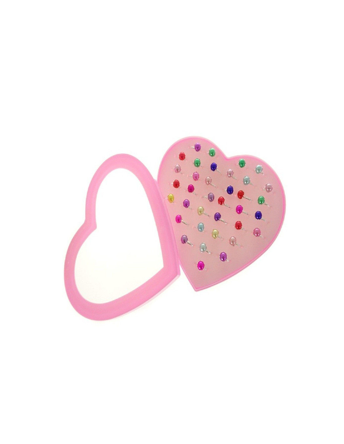 Zestaw pięknych pierścionków dziecięcych z regulacją w różowym pudełeczku w kształcie serca.