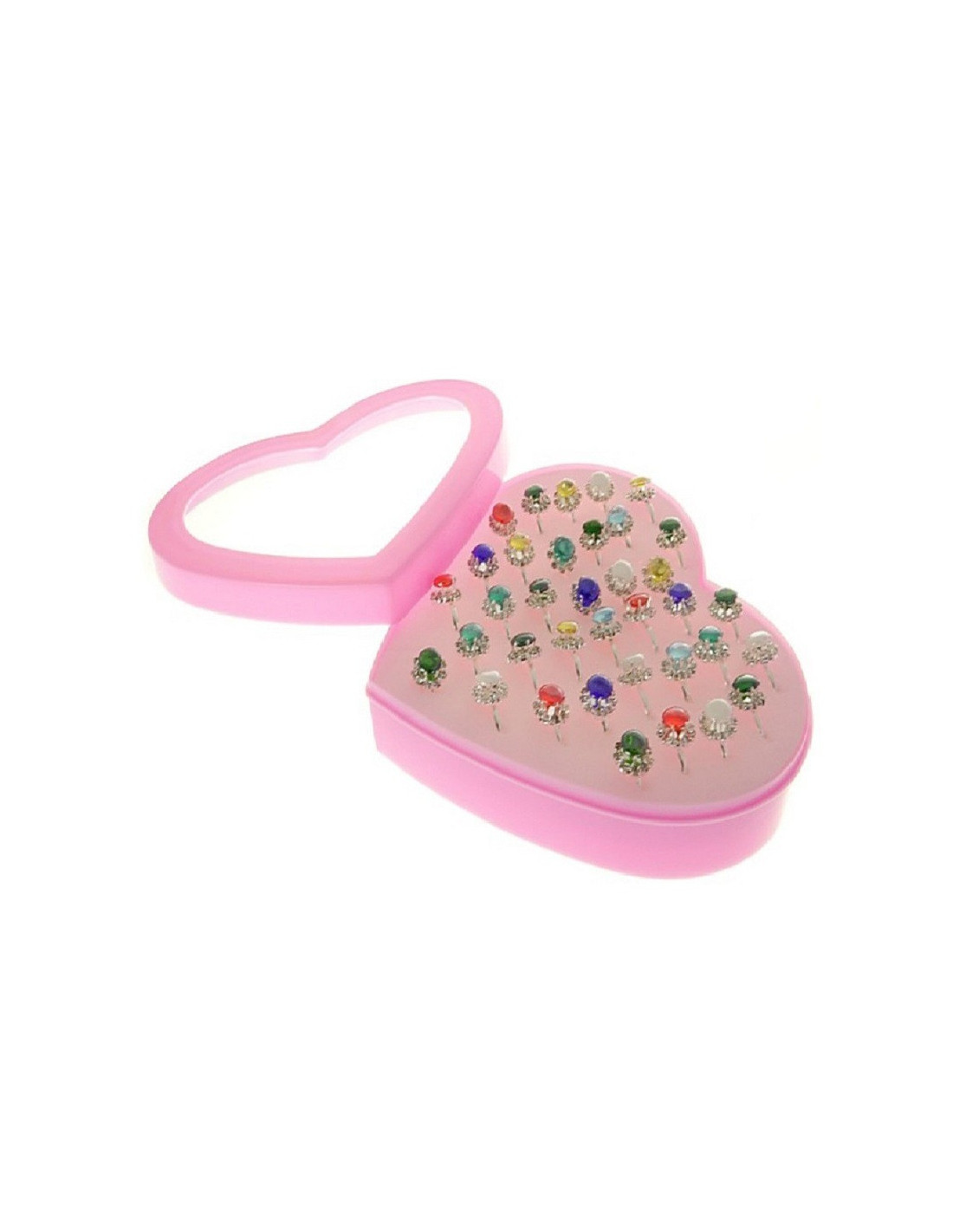 Zestaw pięknych pierścionków dziecięcych z regulacją w różowym pudełeczku w kształcie serca.