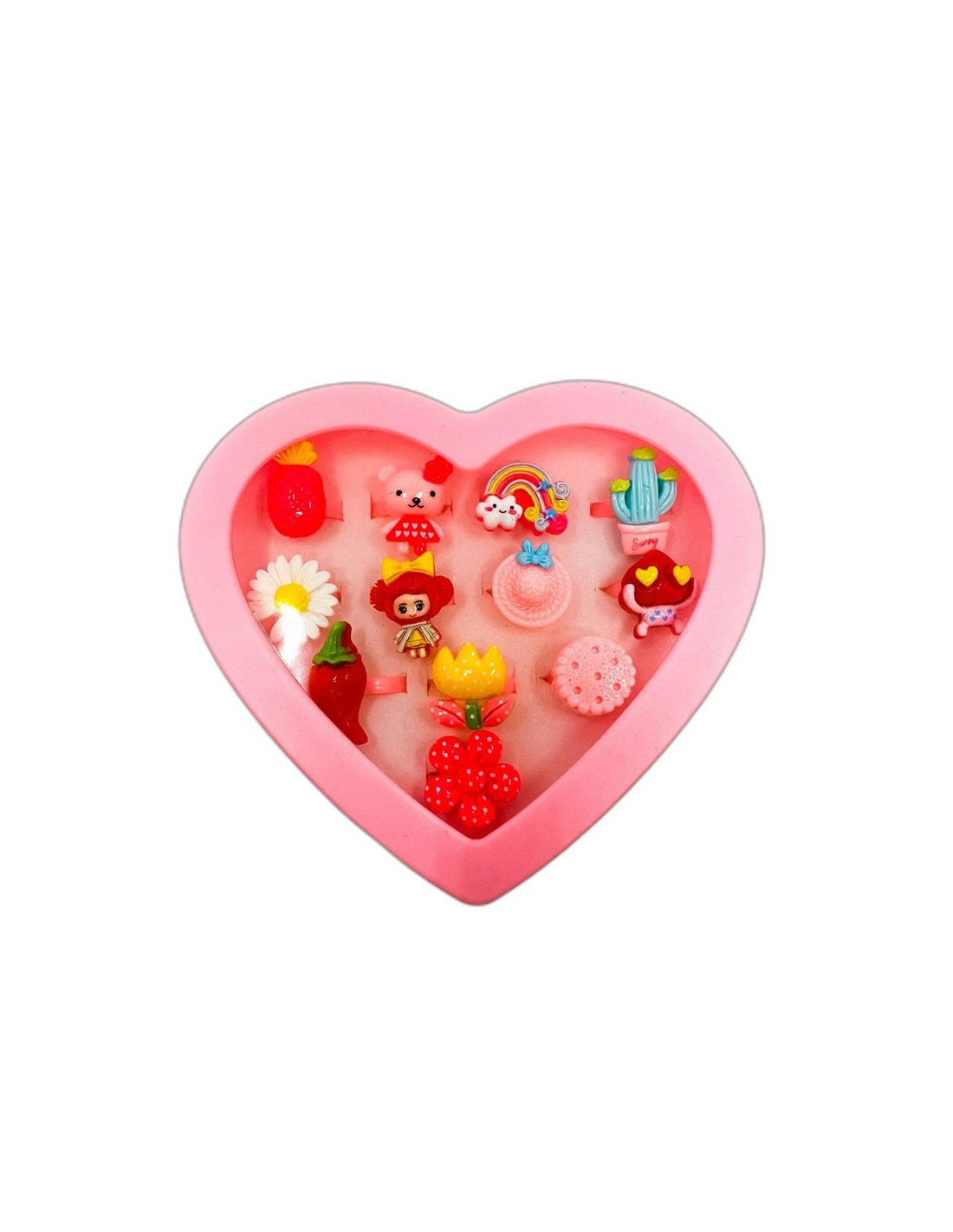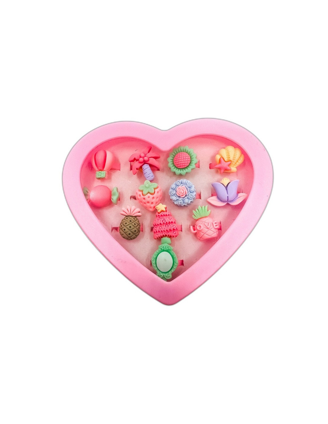 Zestaw pięknych pierścionków dziecięcych z regulacją w różowym pudełeczku w kształcie serca.