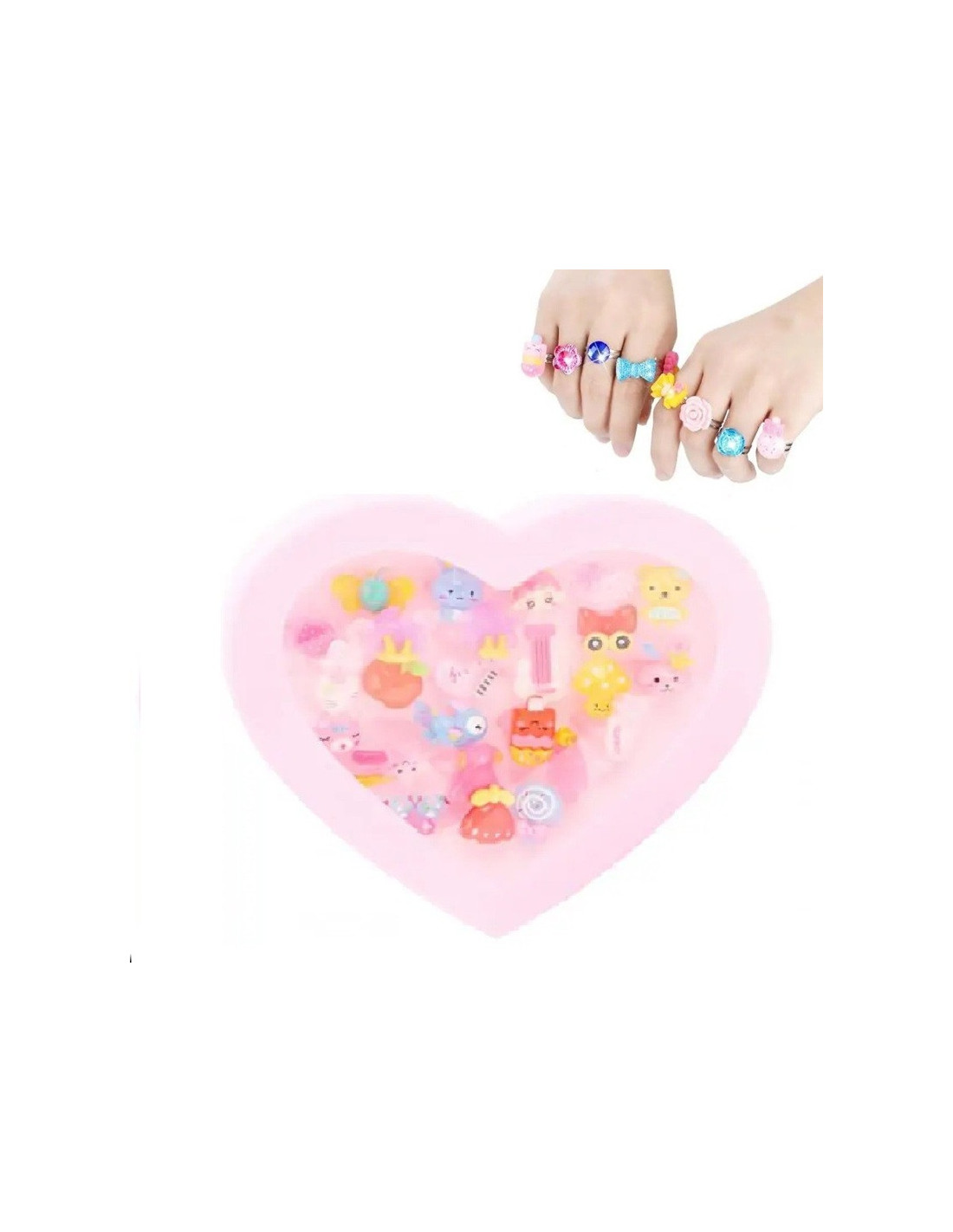 Zestaw pięknych pierścionków dziecięcych z regulacją w różowym pudełeczku w kształcie serca.