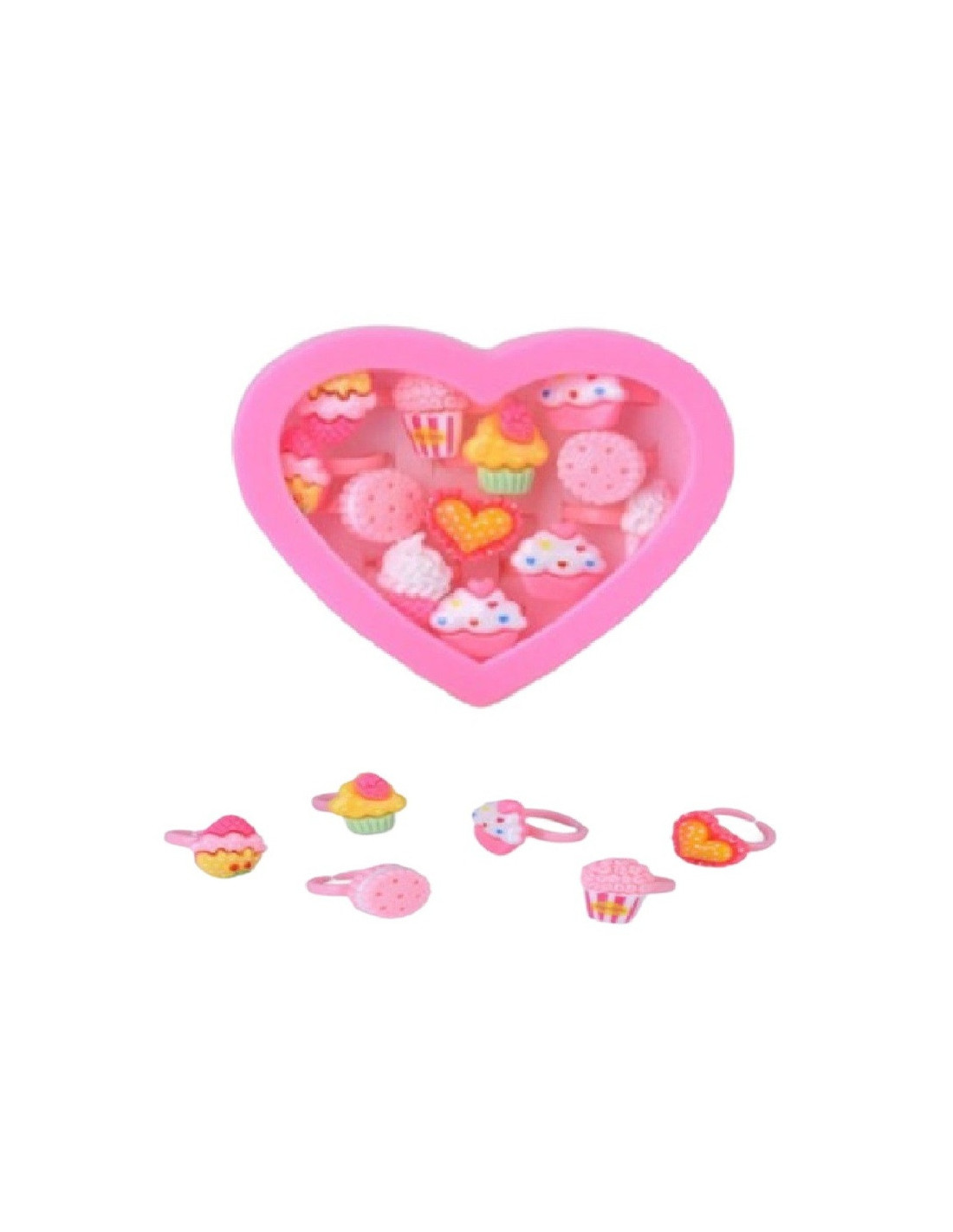 Zestaw pięknych pierścionków dziecięcych z regulacją w różowym pudełeczku w kształcie serca.