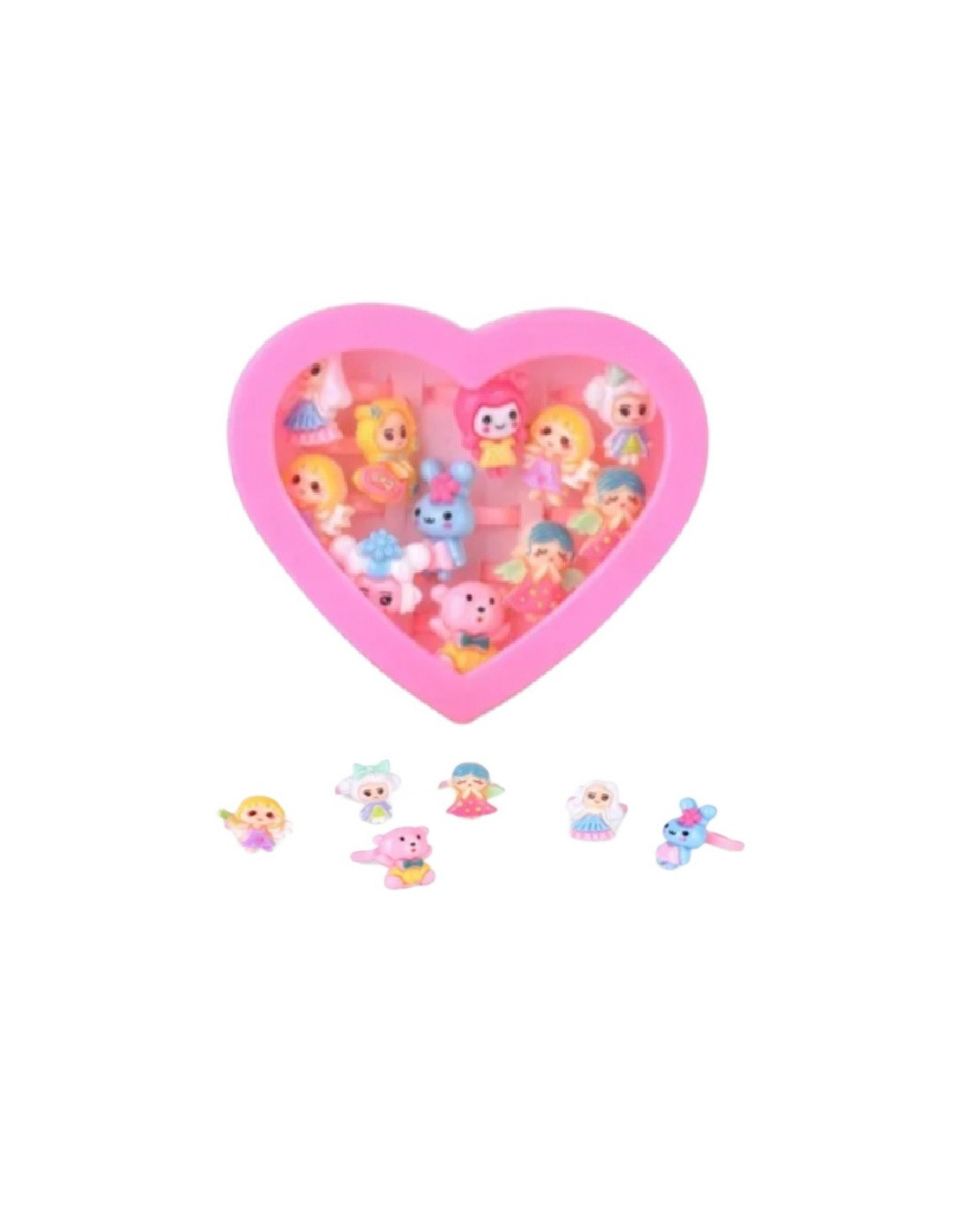 Zestaw pięknych pierścionków dziecięcych z regulacją w różowym pudełeczku w kształcie serca.