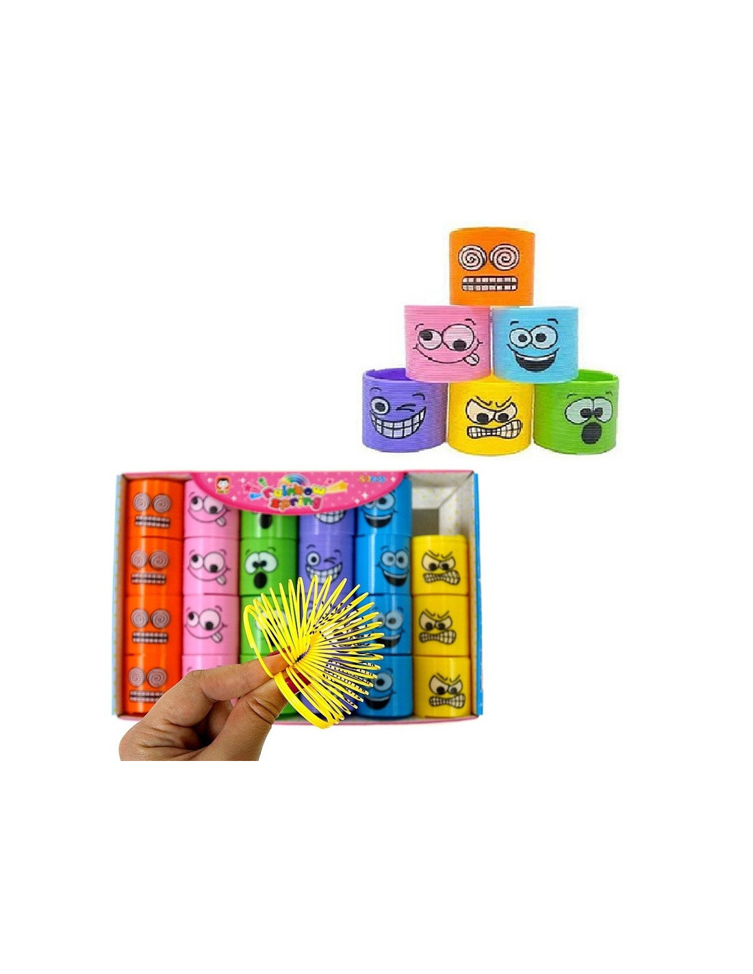Zestaw kolorowych plastikowych sprężynek z buźkami.