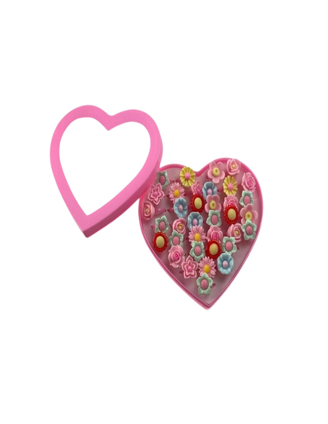 Zestaw pięknych pierścionków dziecięcych z regulacją w różowym pudełeczku w kształcie serca.