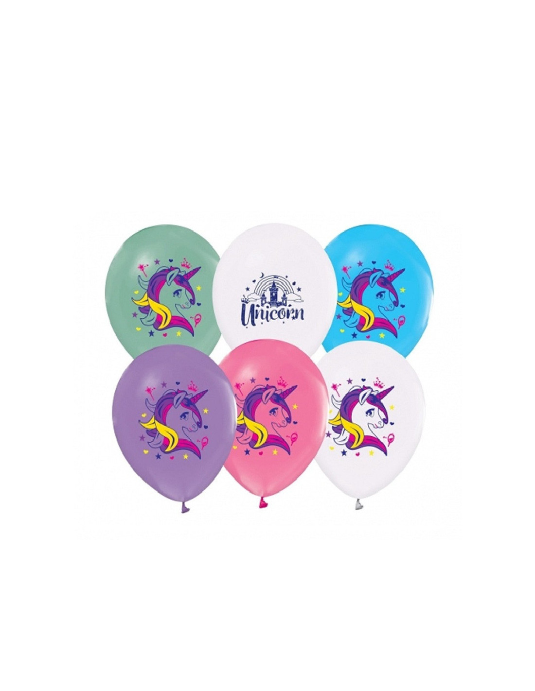 Zestaw kolorowych balonów z jednorożcami.