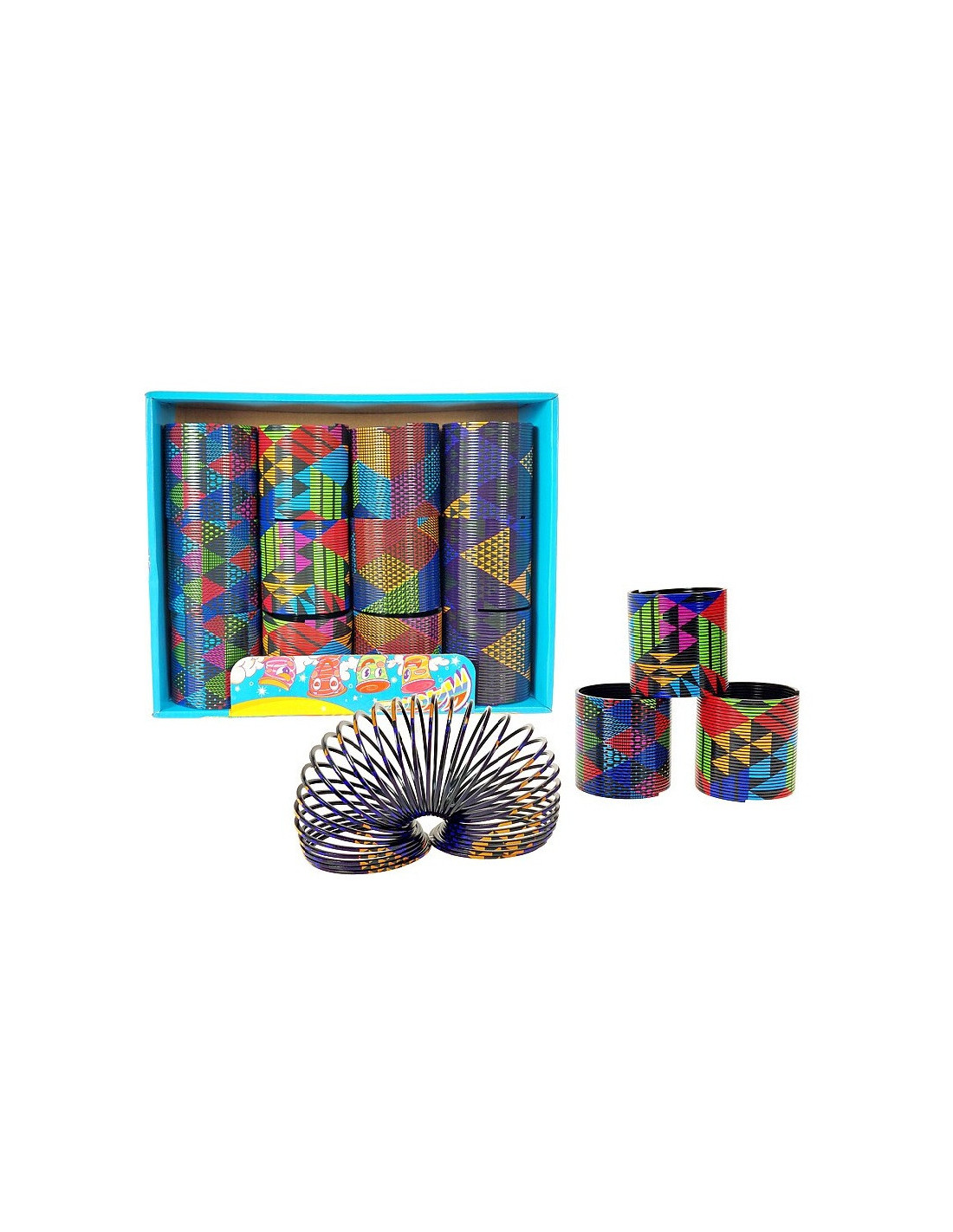 Zestaw kolorowych plastikowych sprężynek z motywem geometrycznych figur.