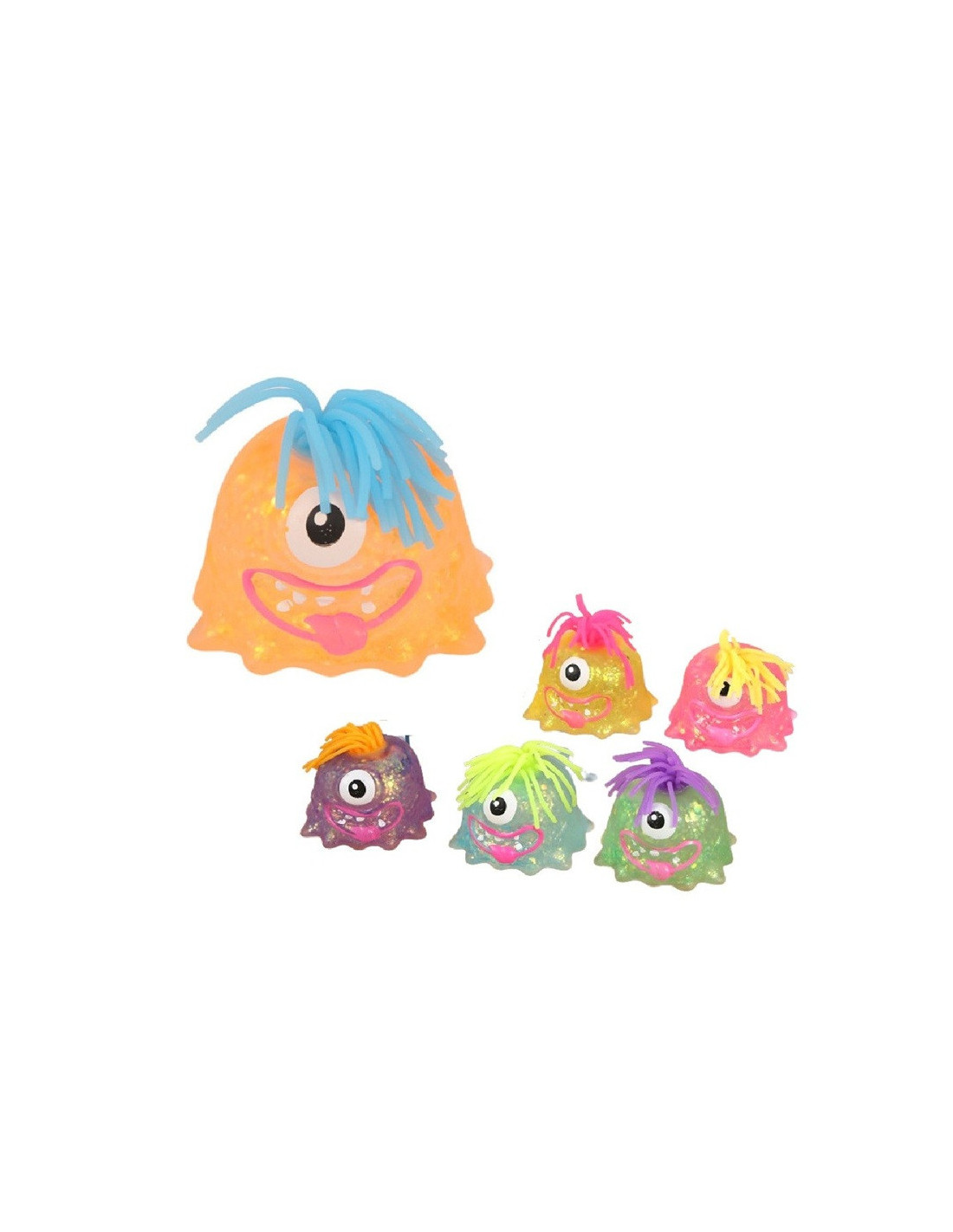 Kolorowy gniotek w kształcie zabawnego potworka z włosami.