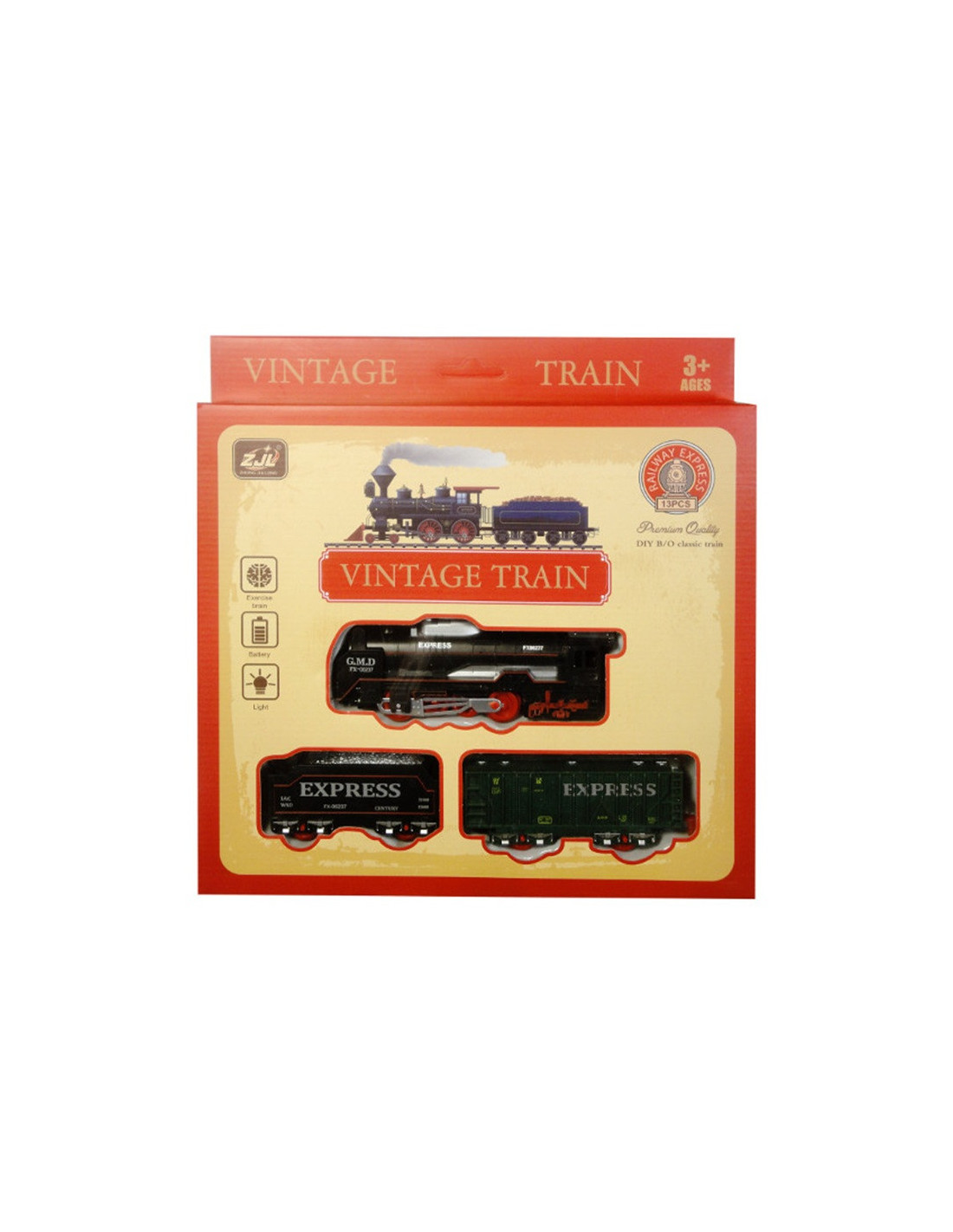 Wymiary opakowania: 26 x 4 x 26 cm, w skład zestawu wchodzi lokomotywa 14 cm oraz 2 wagony o długości 11 cm oraz 9  cm, światło.