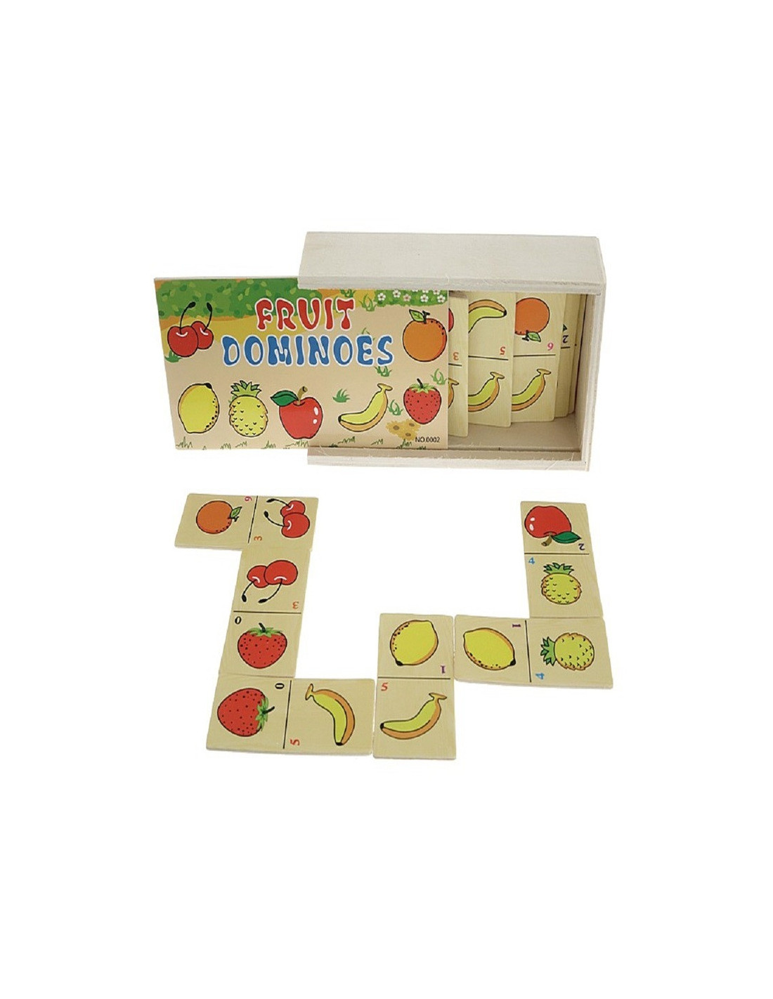 Gra DOMINO w drewnianym pudełku z obrazkami owoców.