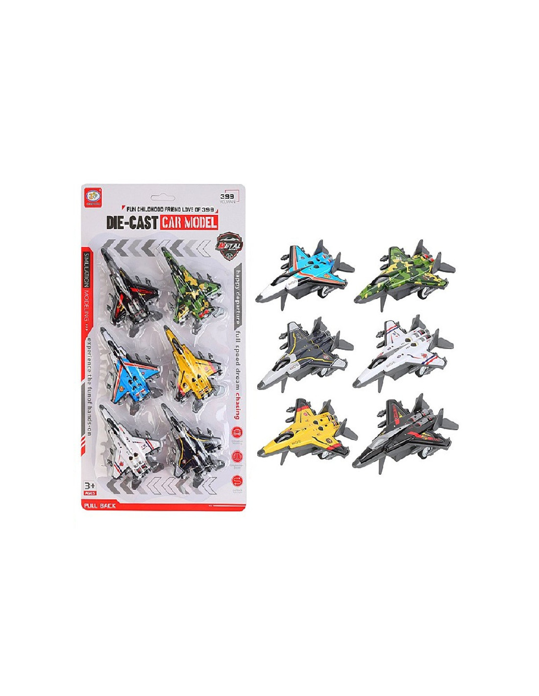 Zestaw kolorowych metalowych samolotów.