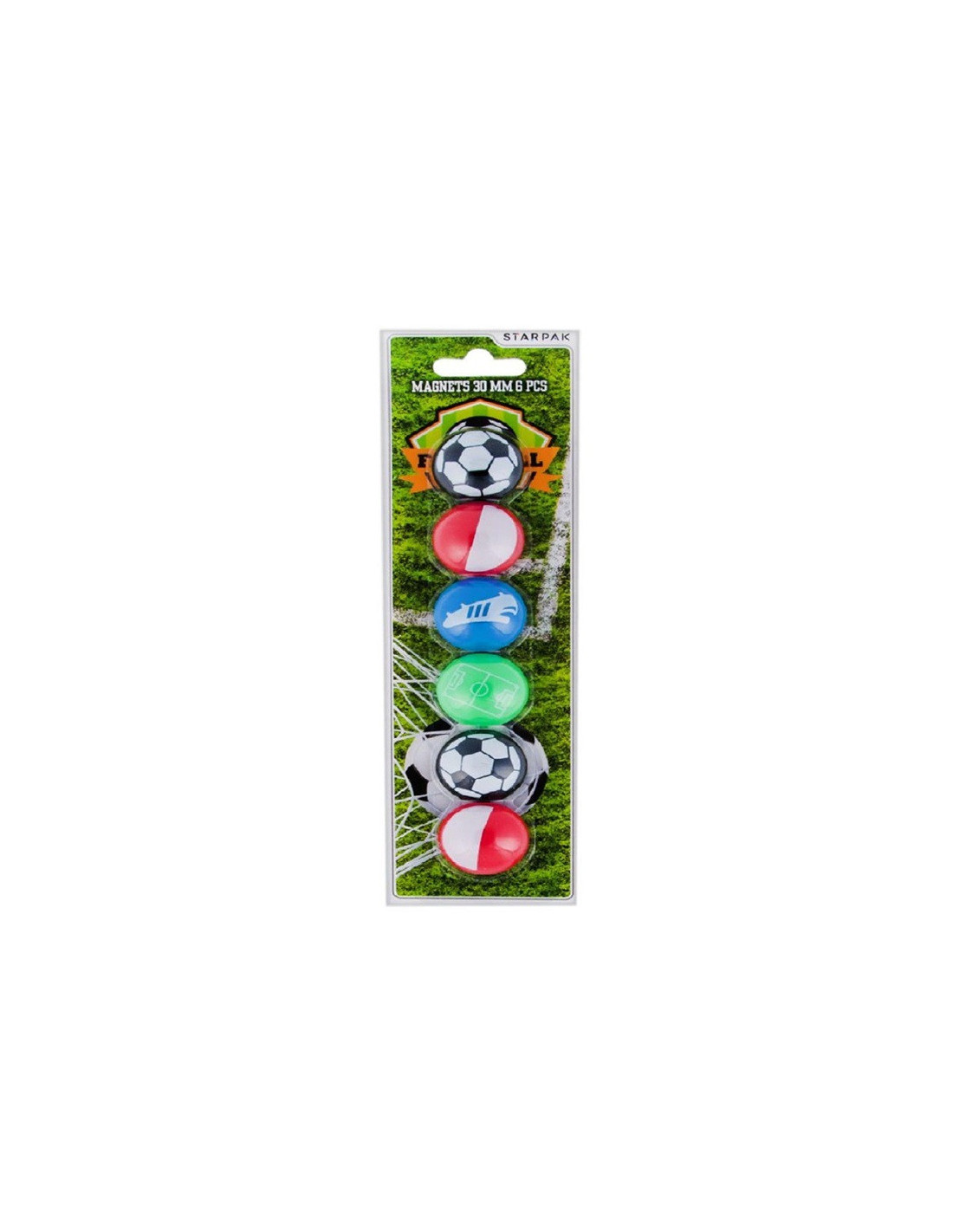 Zestaw mocnych magnesów w plastikowej obudowie z motywem piłki nożnej.