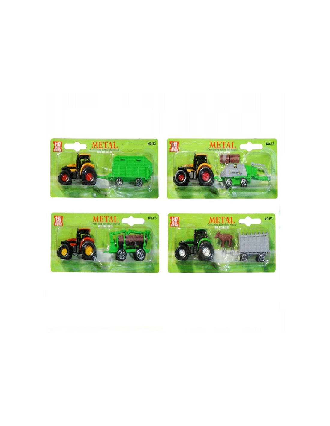 Plastikowo-metalowy traktor z przyczepą.