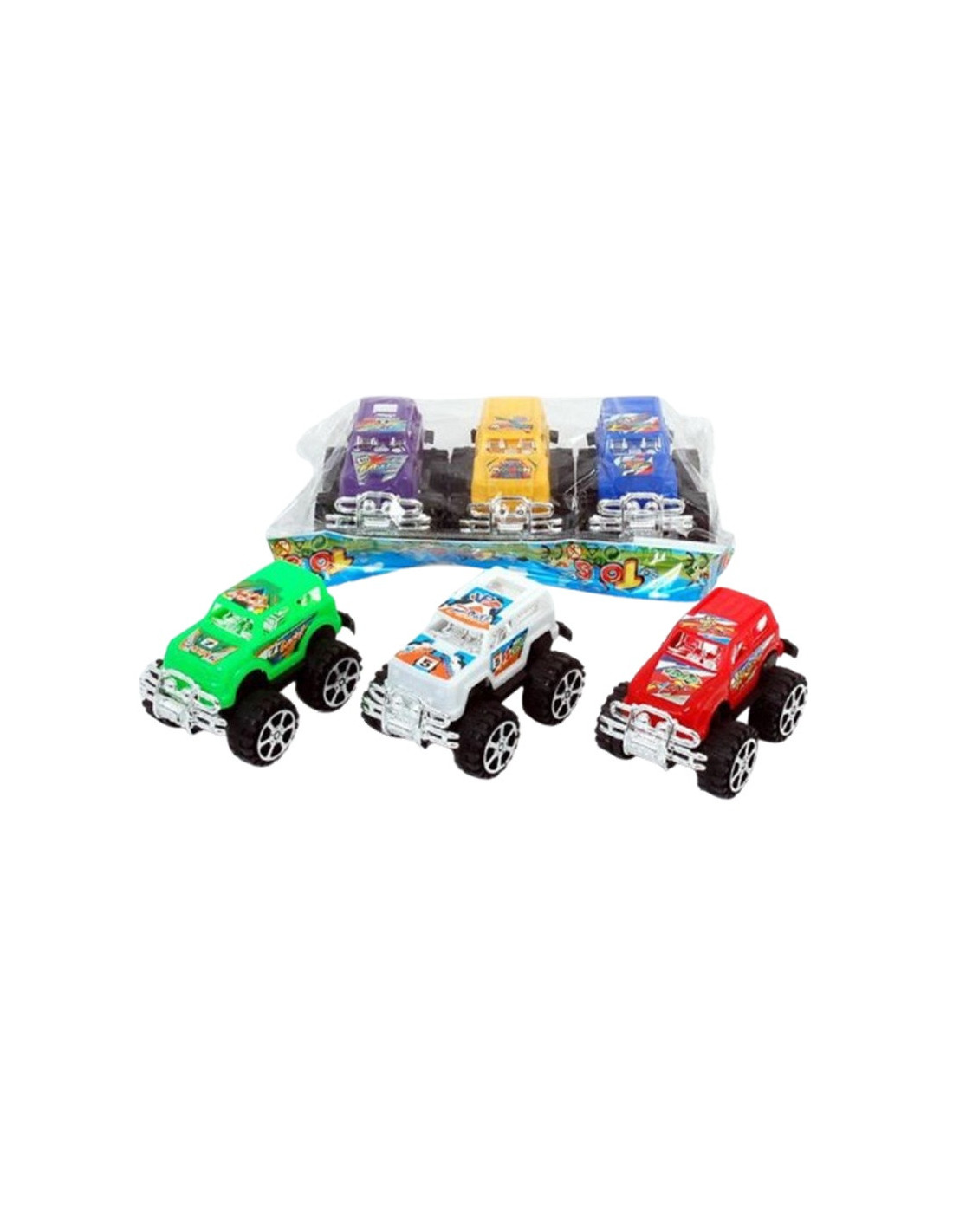 Zestaw kolorowych plastikowych pojazdów terenowych.