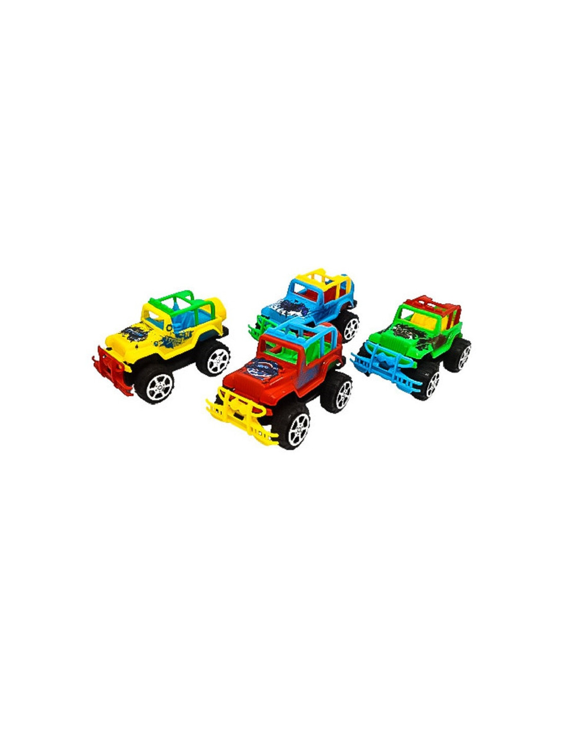 Zestaw kolorowych plastikowych pojazdów terenowych.