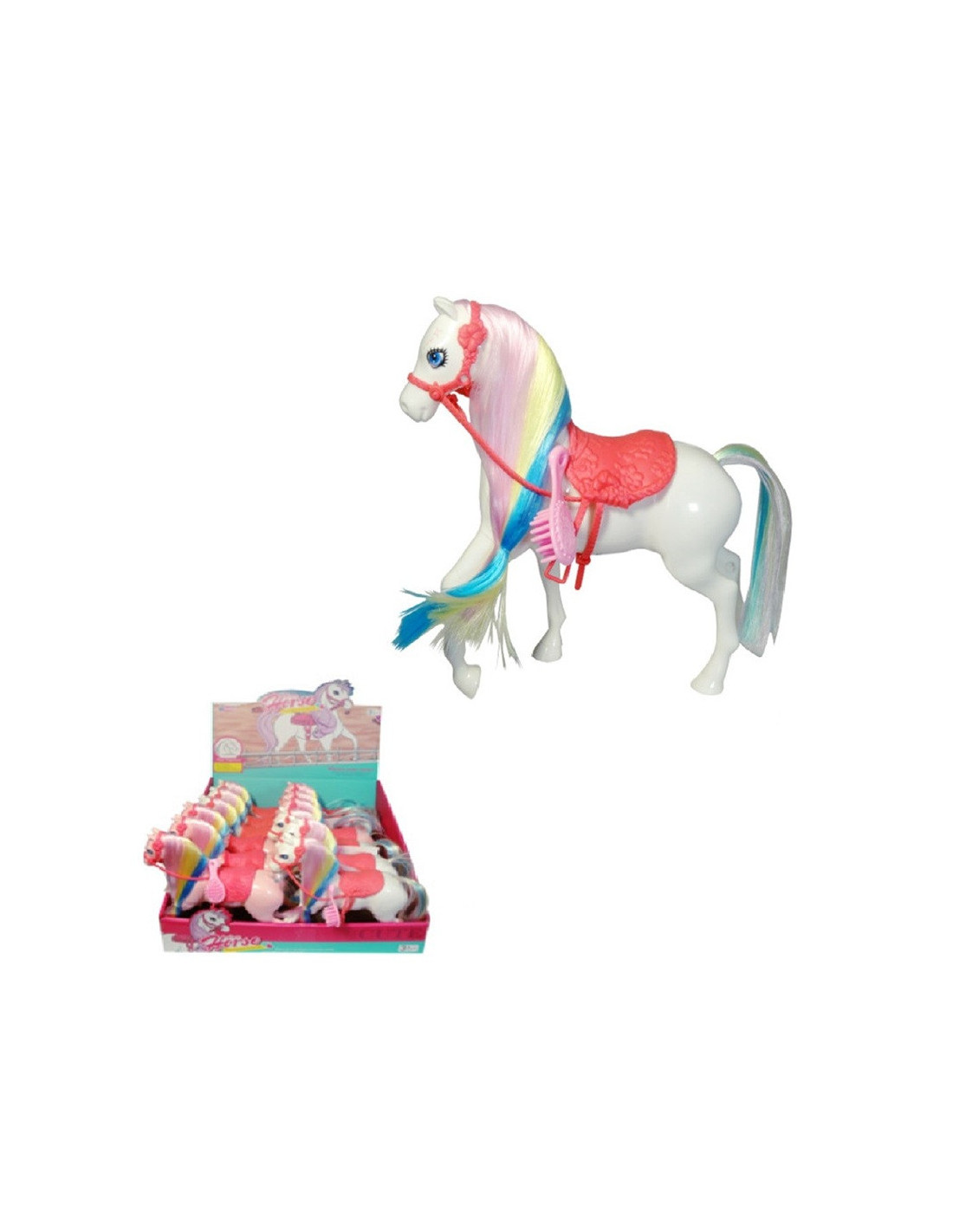Kolorowy konik z grzywką i akcesoriami.