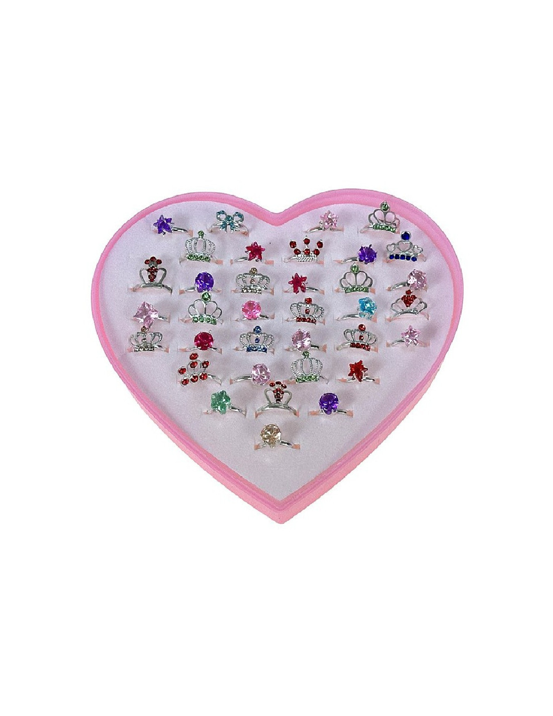 Zestaw pięknych pierścionków dziecięcych z regulacją w różowym pudełeczku w kształcie serca.