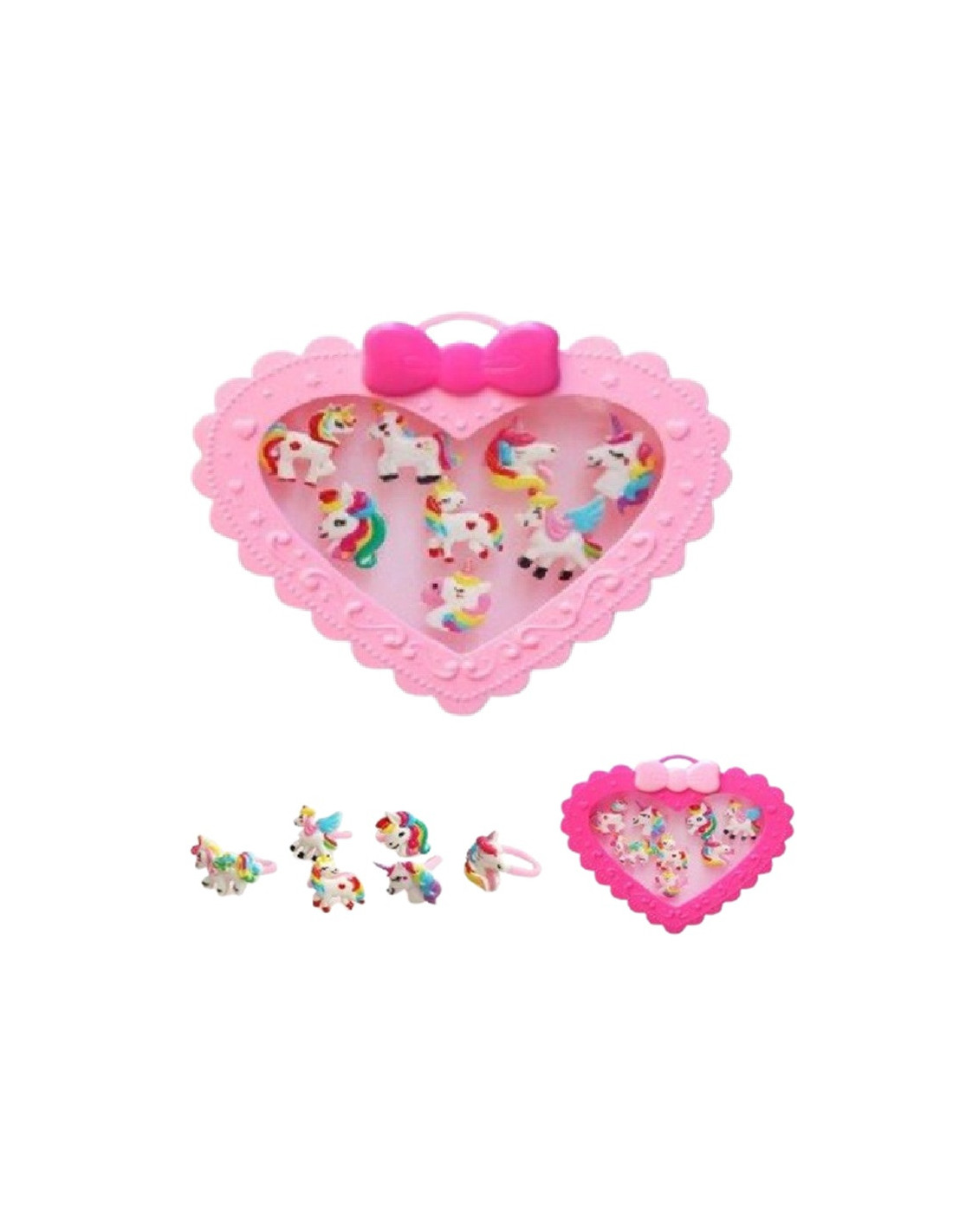 Zestaw pięknych pierścionków dziecięcych z regulacją w różowym pudełeczku w kształcie serca.