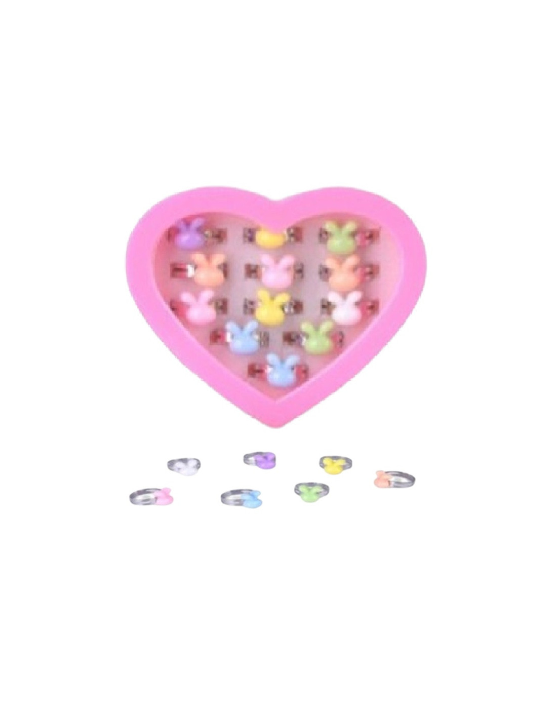Zestaw pięknych pierścionków dziecięcych z regulacją w różowym pudełeczku w kształcie serca.