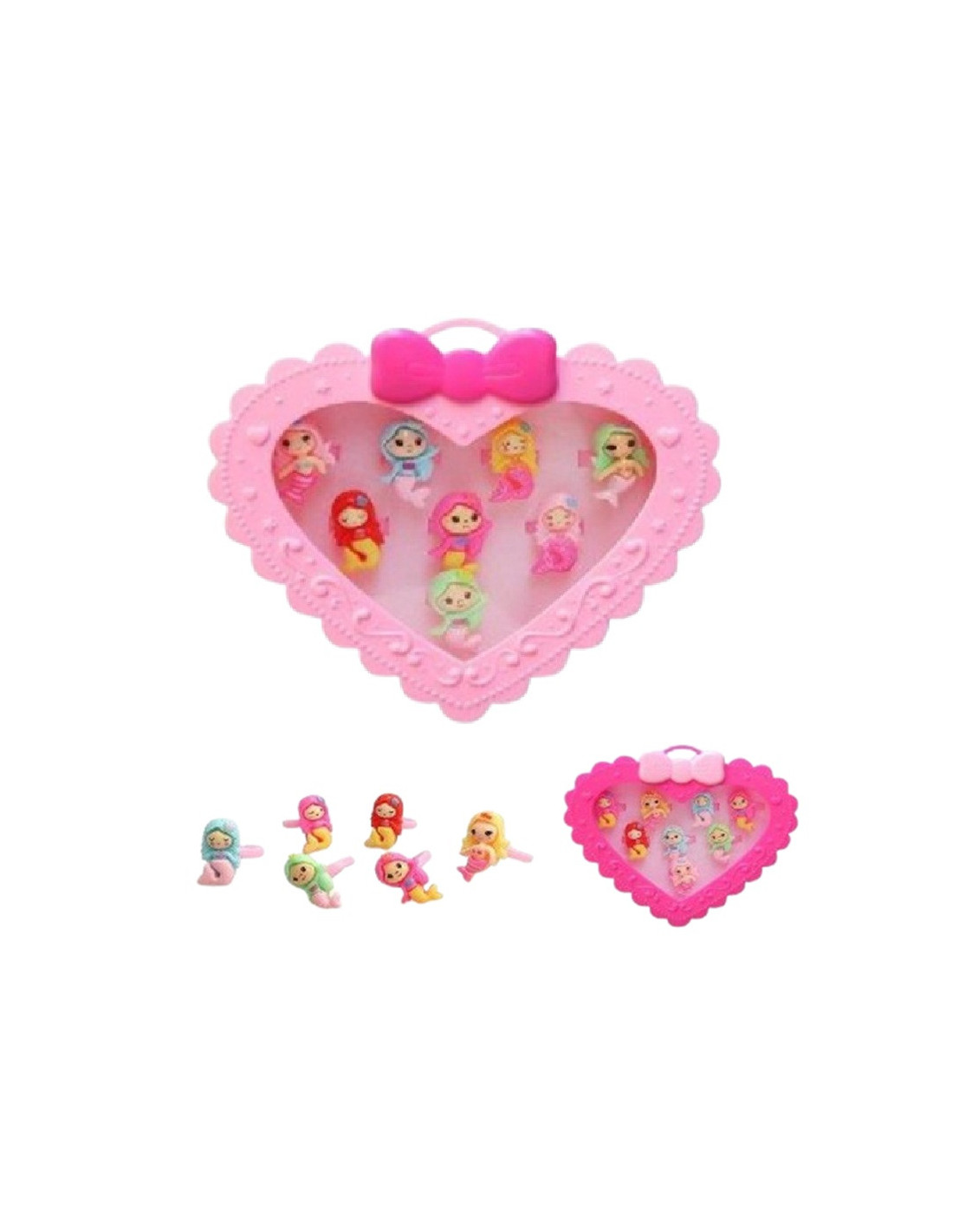Zestaw pięknych pierścionków dziecięcych z regulacją w różowym pudełeczku w kształcie serca.