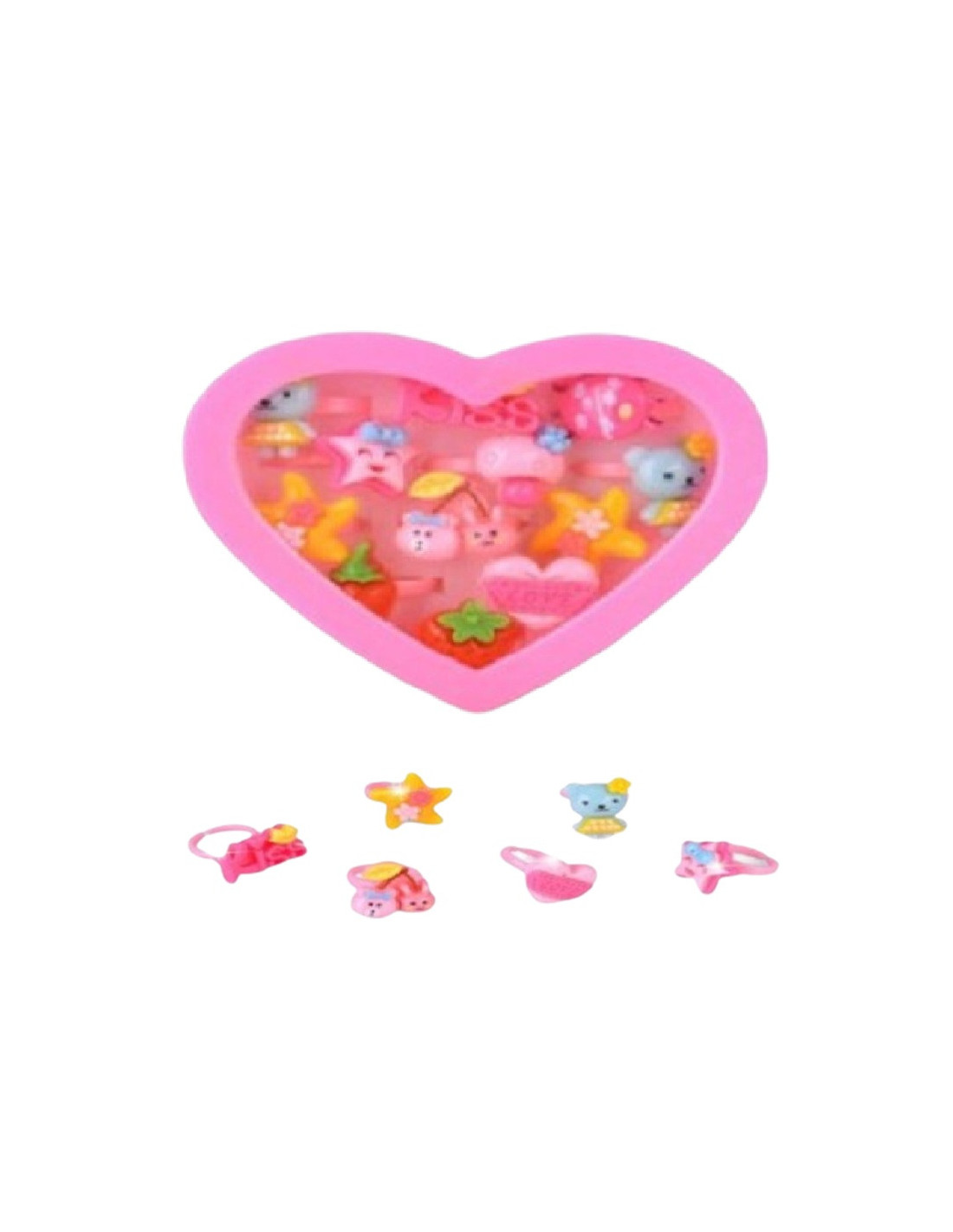 Zestaw pięknych pierścionków dziecięcych z regulacją w różowym pudełeczku w kształcie serca.