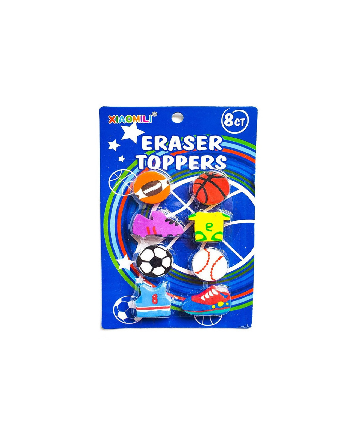 Gumki szkolne w kształcie piłek i koszulek sportowych.