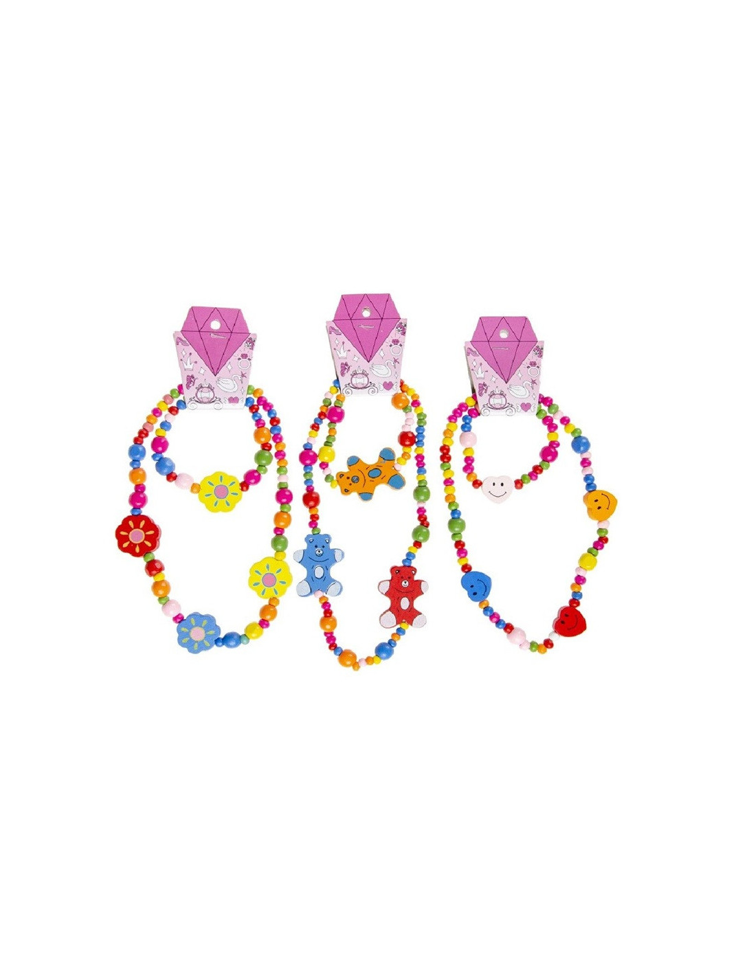 Zestawy drewnianej biżuterii z motywem serduszek, misiów lub kwiatków.