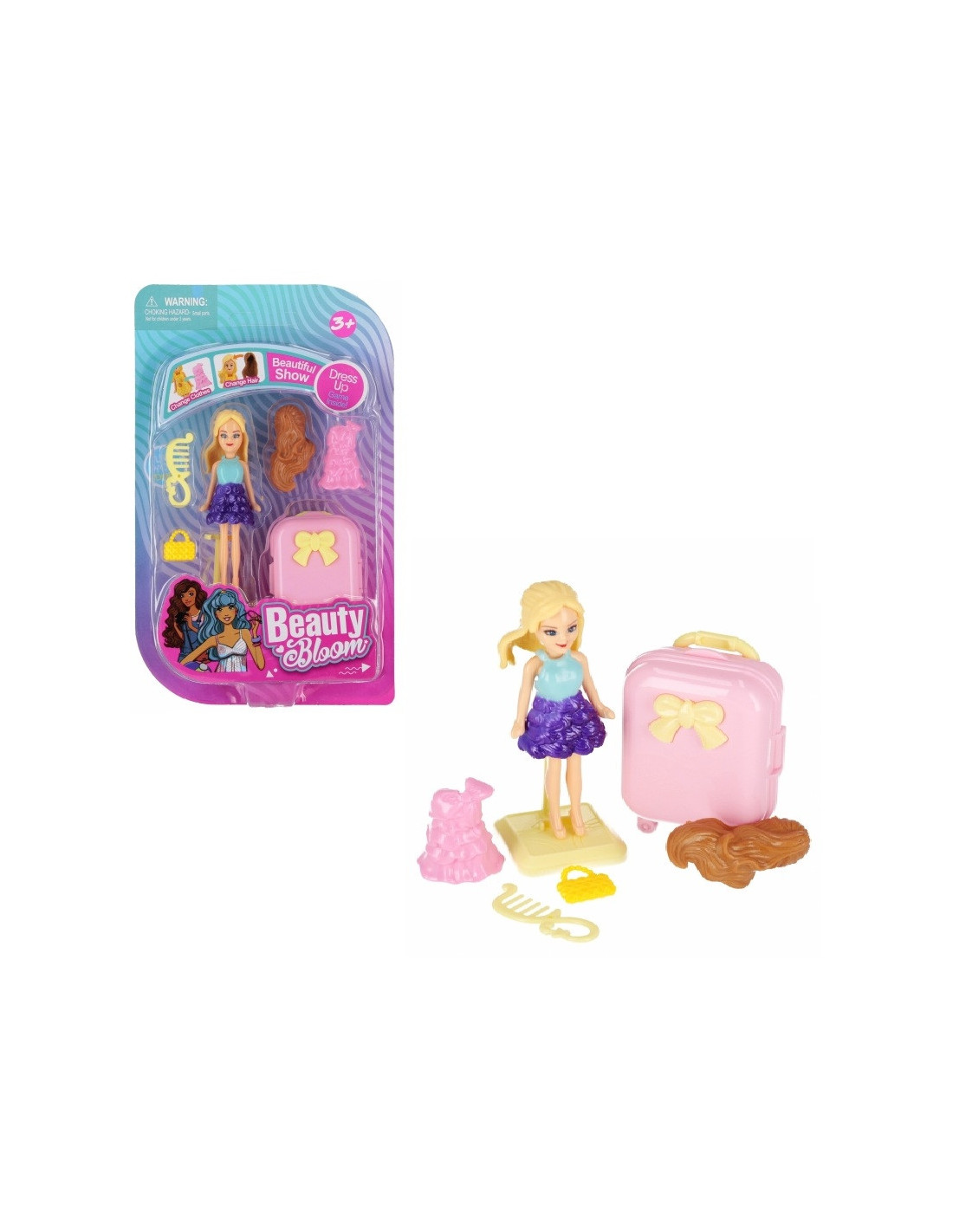 W jednym opakowaniu lalka z akcesoriami tj.: walizka, torebka, grzebień do włosów, sukienki.